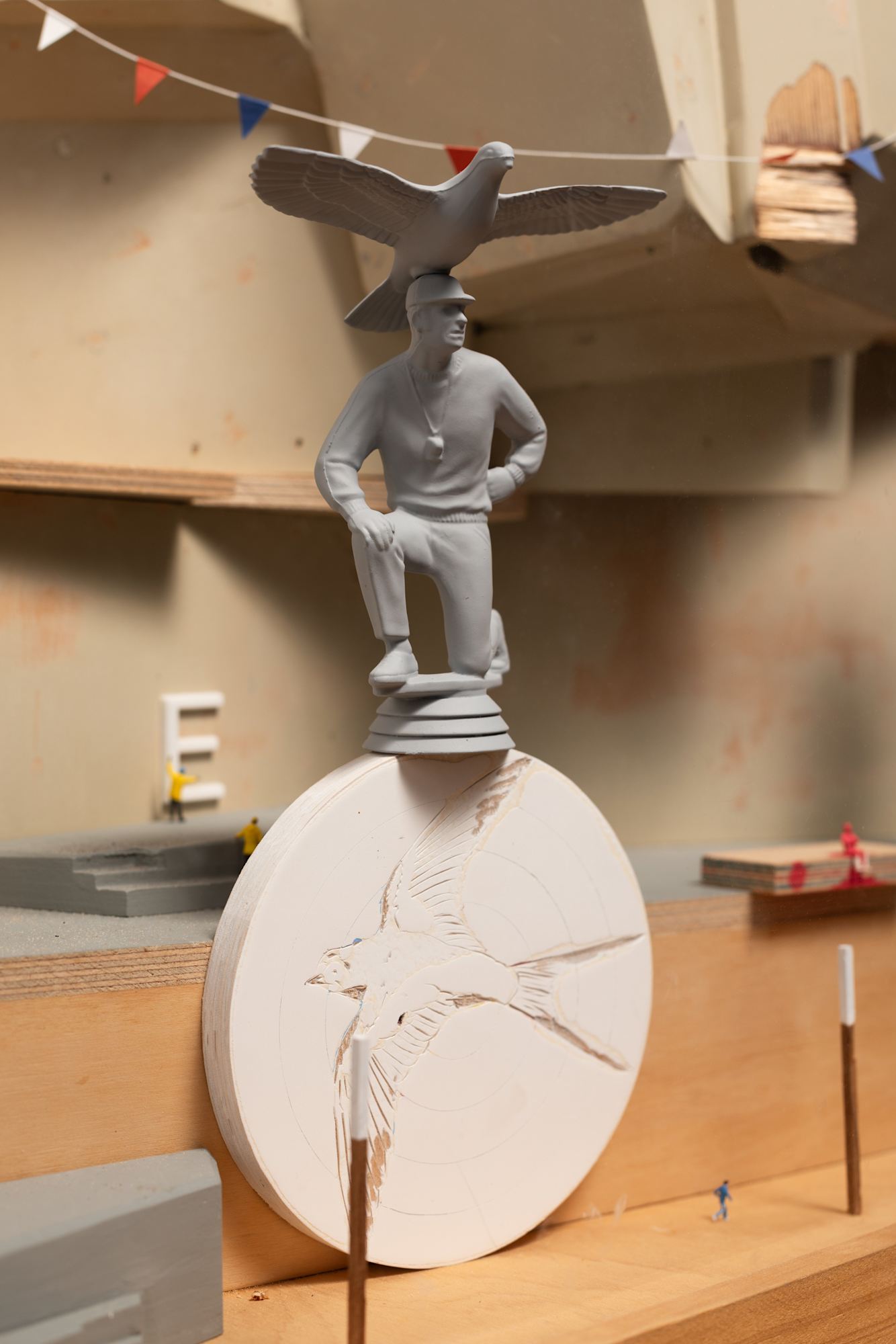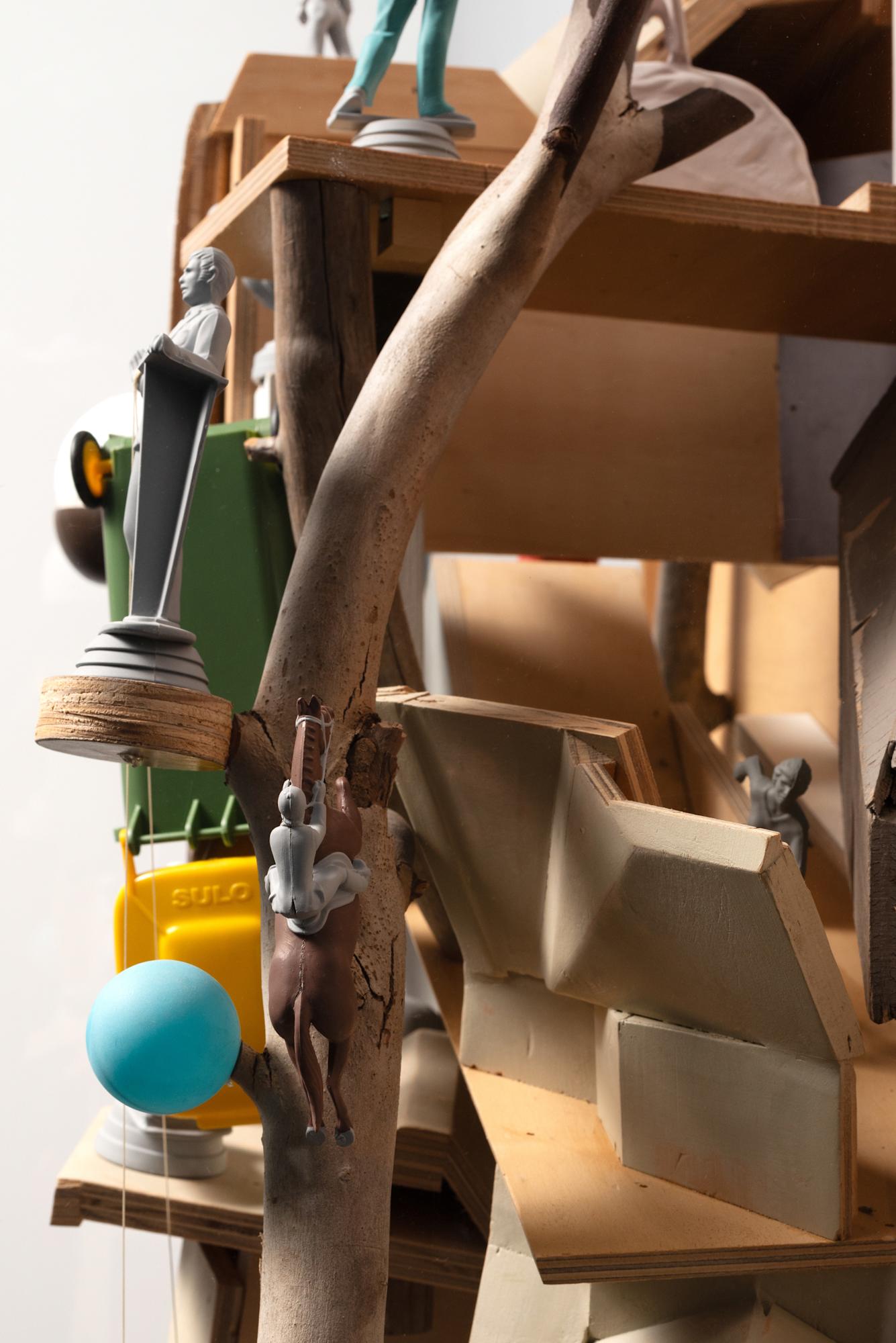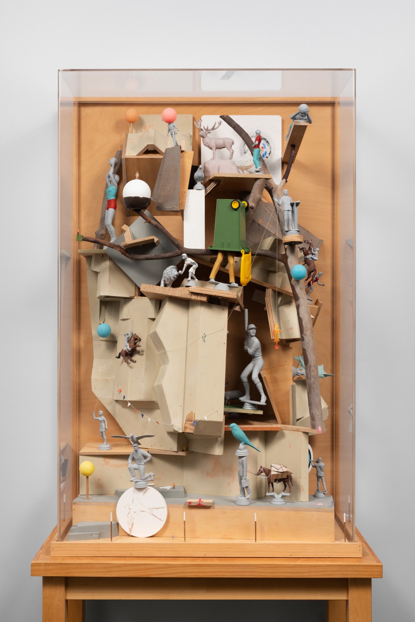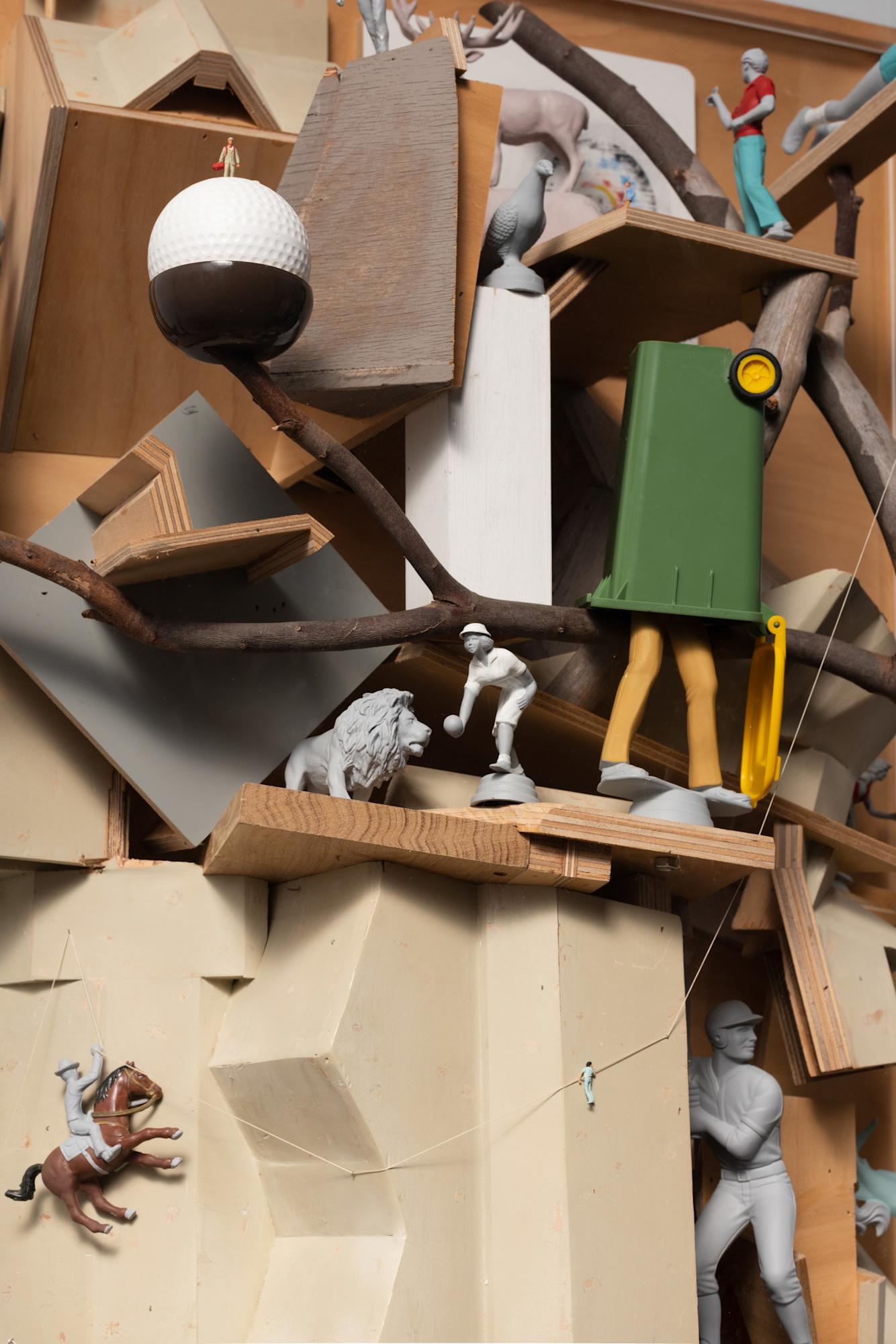 Bruce Slatter's "Precipice" is a playful sculpture with elements of humour and absurdity. It is a diorama with multiple scenarios that contain figures and objects to describe a strange event. The scene spans domestic, sporting, recreational and defence settings.