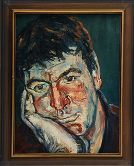 Bold brushstrokes in oranges, whites and blues form the shading and definition of this portrait of a man called Stevie. With his head rested on his hand, ‘Stevie’ gazes into the distance, in part contemplation, perhaps part in contented reflection.