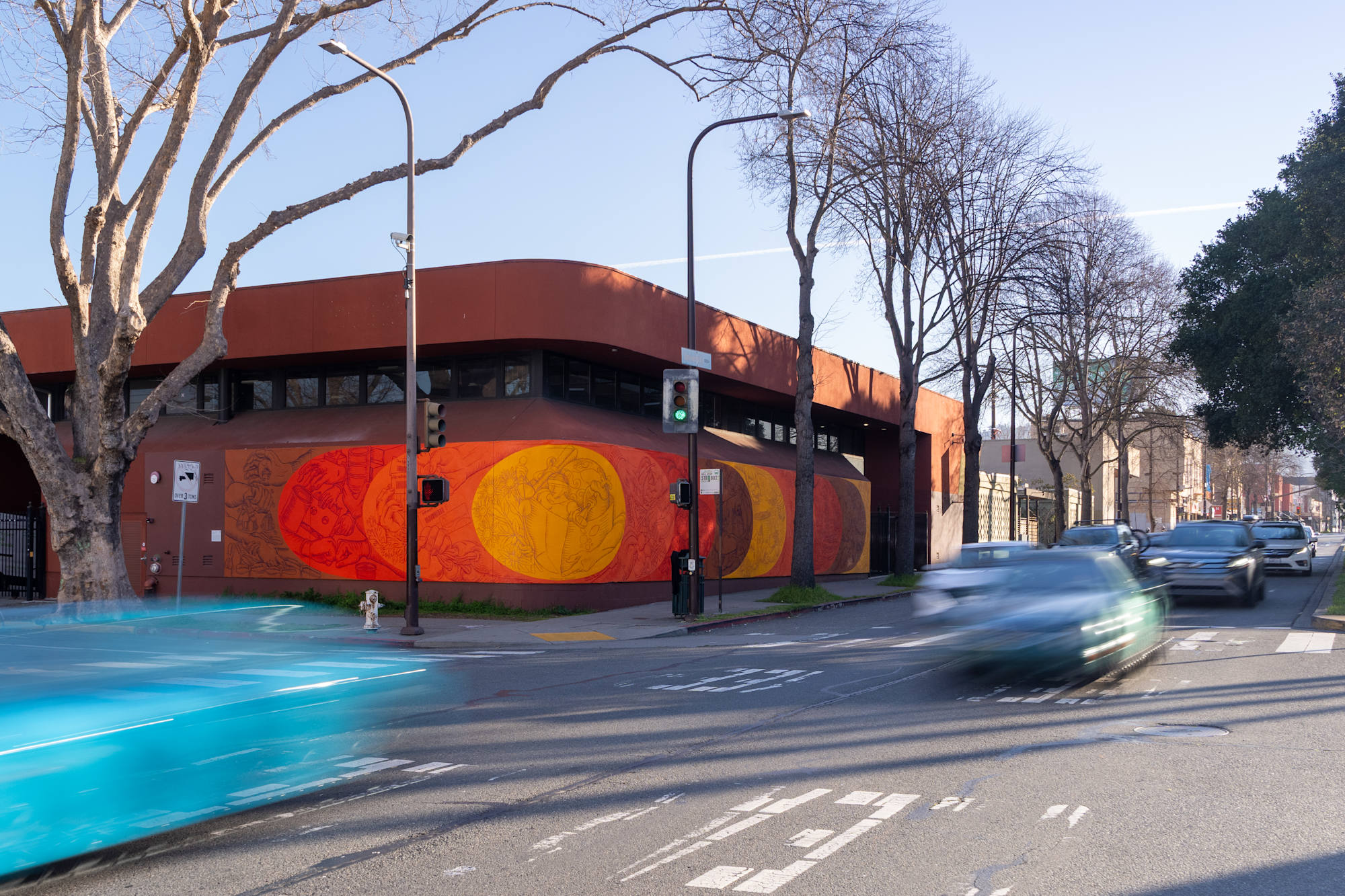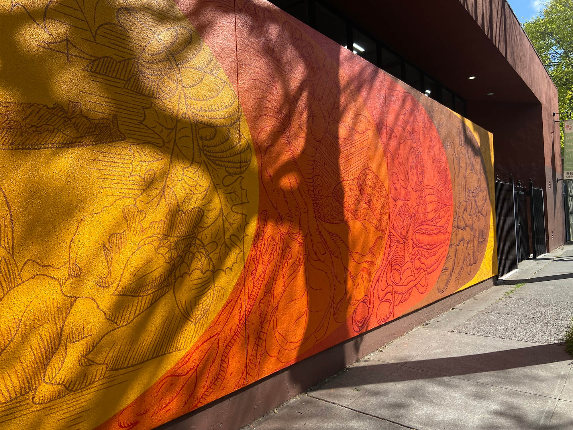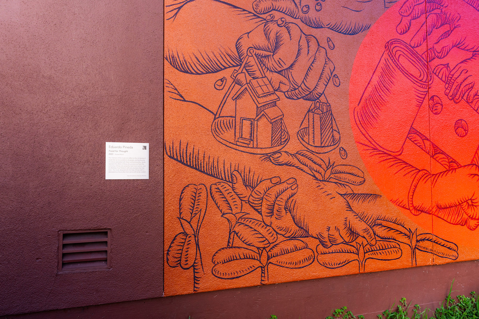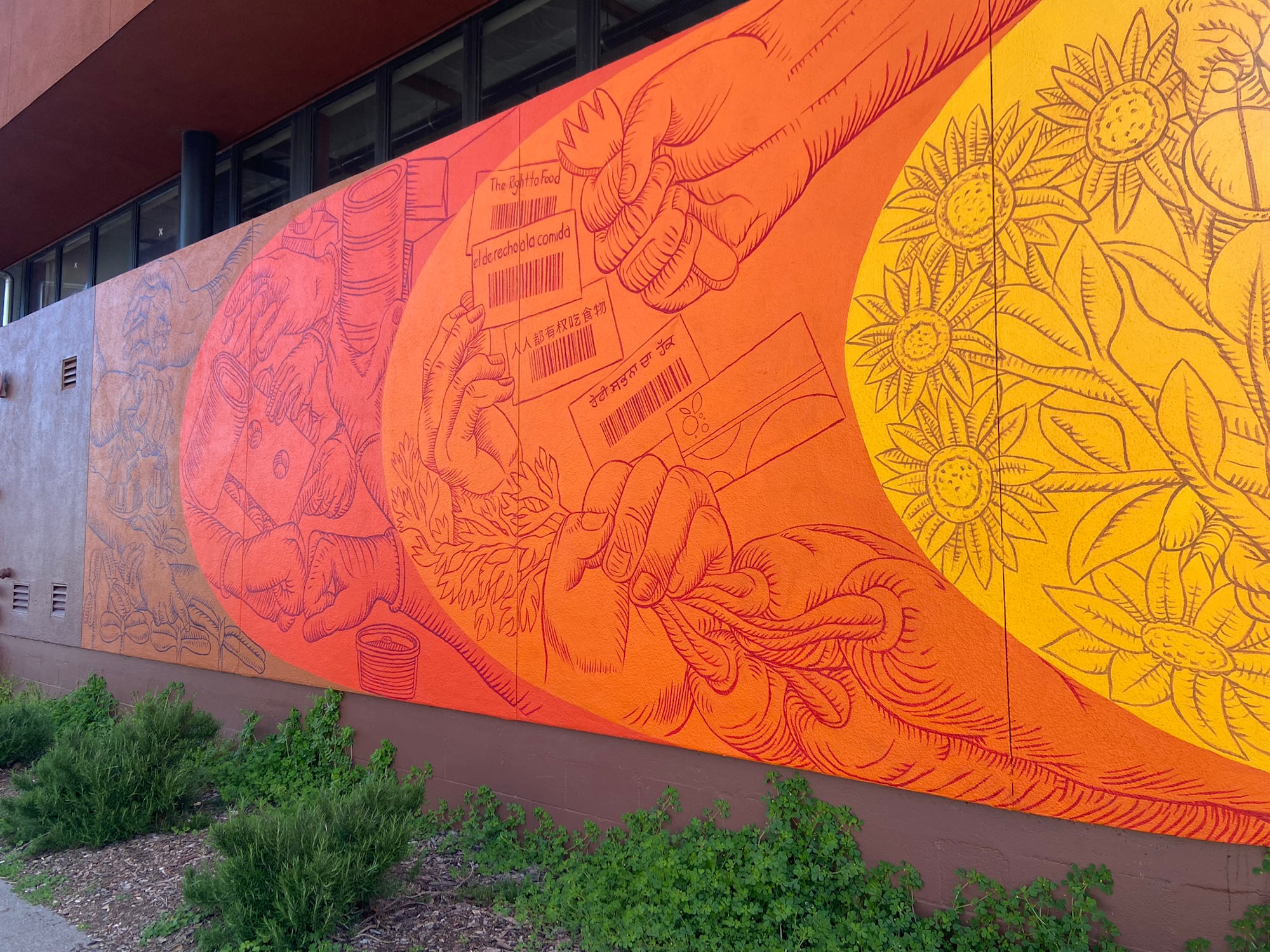 The intention of this mural is to reflect on the rich variety of foods that can be available to all people, and the diversity of cultures associated with these nutritional sources. Hands represent the efforts of those who produce our food, the autonomy of those who presently need more nutrition, and the Berkeley Food Network staff and volunteers that help them. The mural, designed with the help of those staff, is dedicated to a future when their service will not be needed.