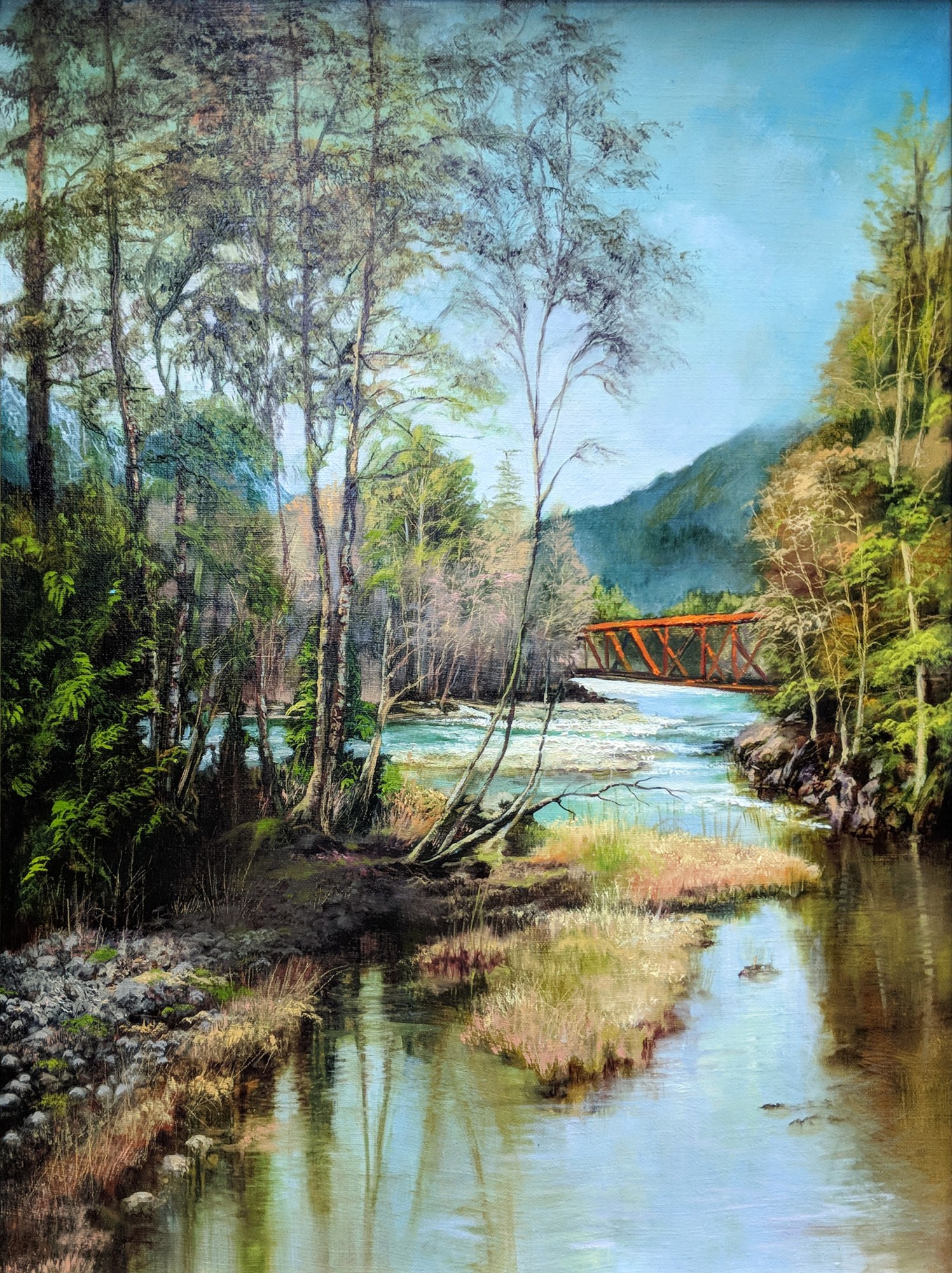 .. a rather poignant moment standing on an old wooden bridge just yards away from the end of the road where it seems the rest of the bridge and a portion of road had been washed away by a stormy, raging river. Looking up from the gentle blue-green reflections in now shallow water, after surveying the devastating damage the storm-path had wrought on the river-crossing I was on - a bright red railway bridge caught my eye.