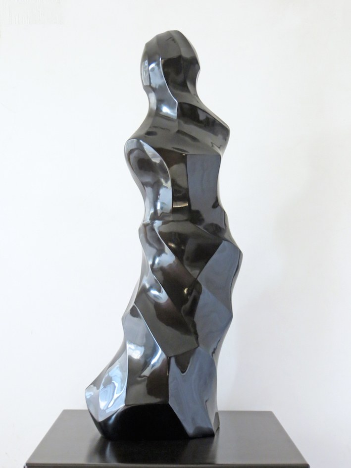 Contenida dentro de formas prismáticas, esta misteriosa silueta parece mirar hacia otro lado. El acabado negro brillante enriquece los reflejos para incluir en ellos toda una paleta de tonos sutiles.