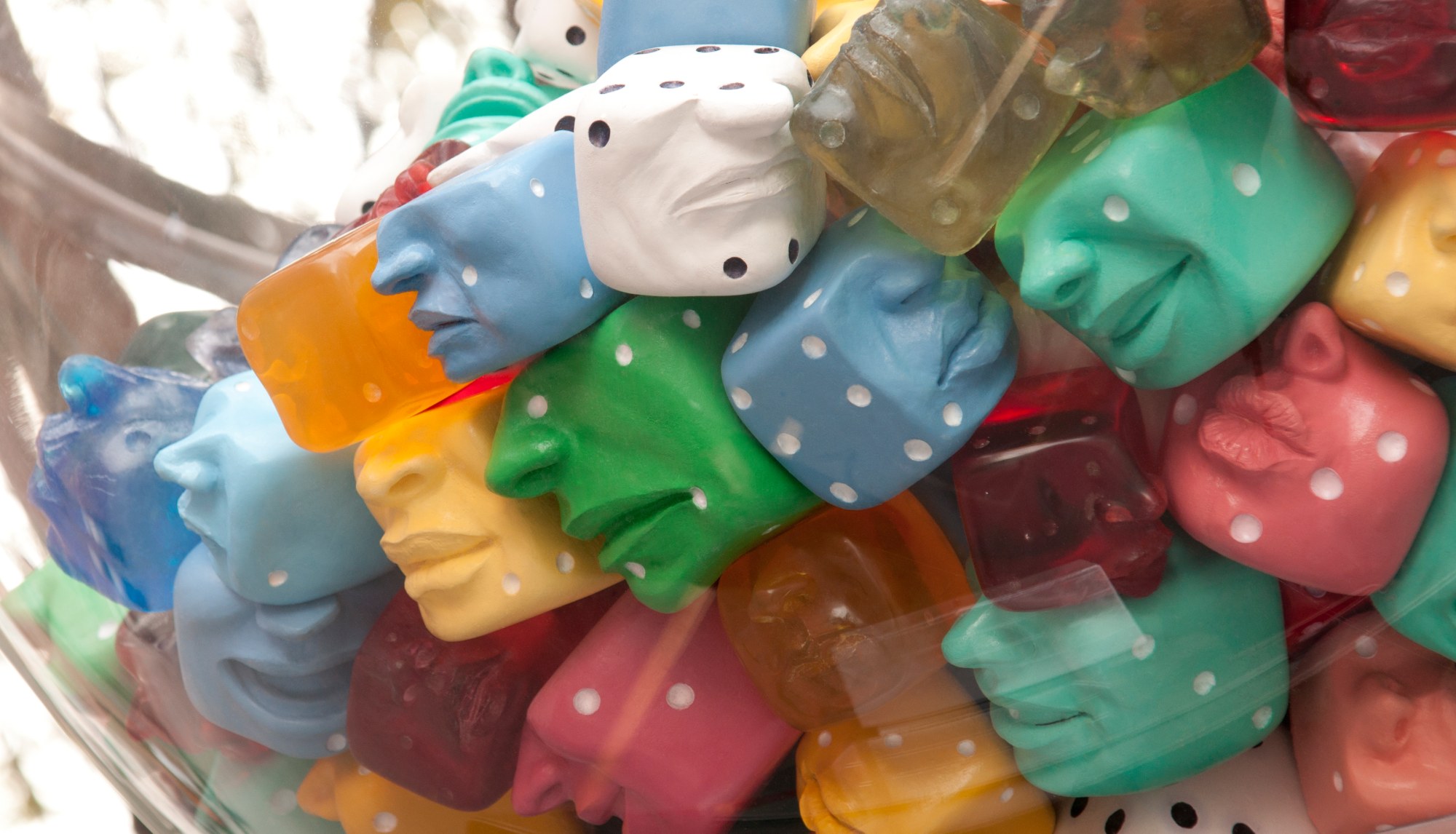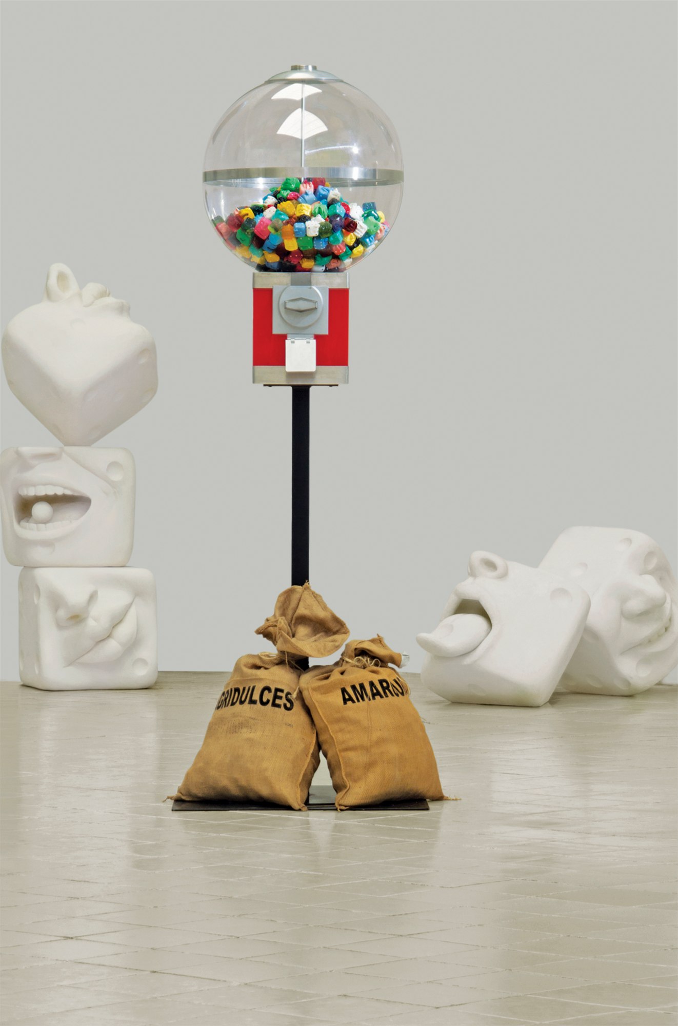 Un dispensador gigante que despierta el niño interior y nos recuerda el asombro frente a las promesas de un mundo lleno de posibilidades. En su interior, los “chicles” en forma de dados con rostros de diferentes expresiones y colores, bonitos o feos, felices o desdichados, se parecen a las experiencias que atribuimos al azar. La vida está hecha de una infinidad de sabores y oportunidades.