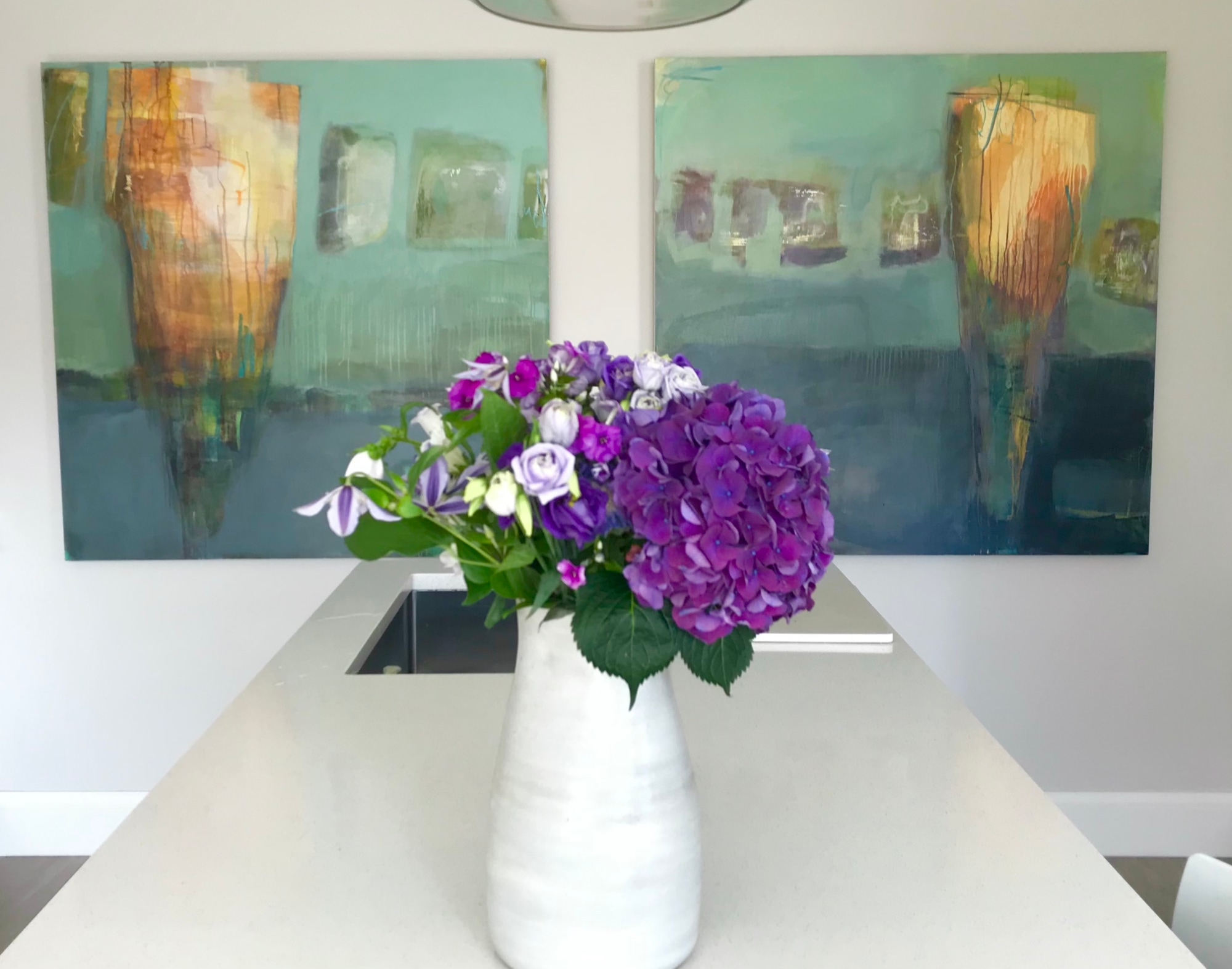 This large-scale abstract painting captures the delicate drama of tiny woodland flowers vying for sunlight on the forest floor.