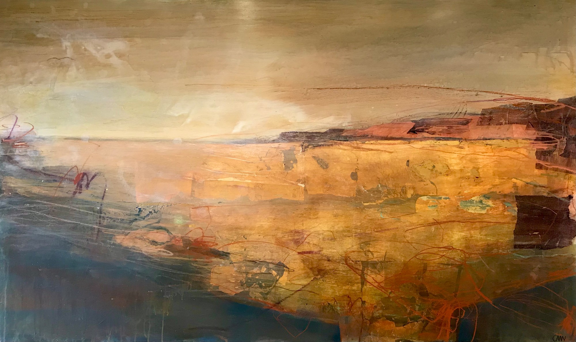 - Acrylic, gold leaf, hand painted collage and drawing on deep cradled panel.