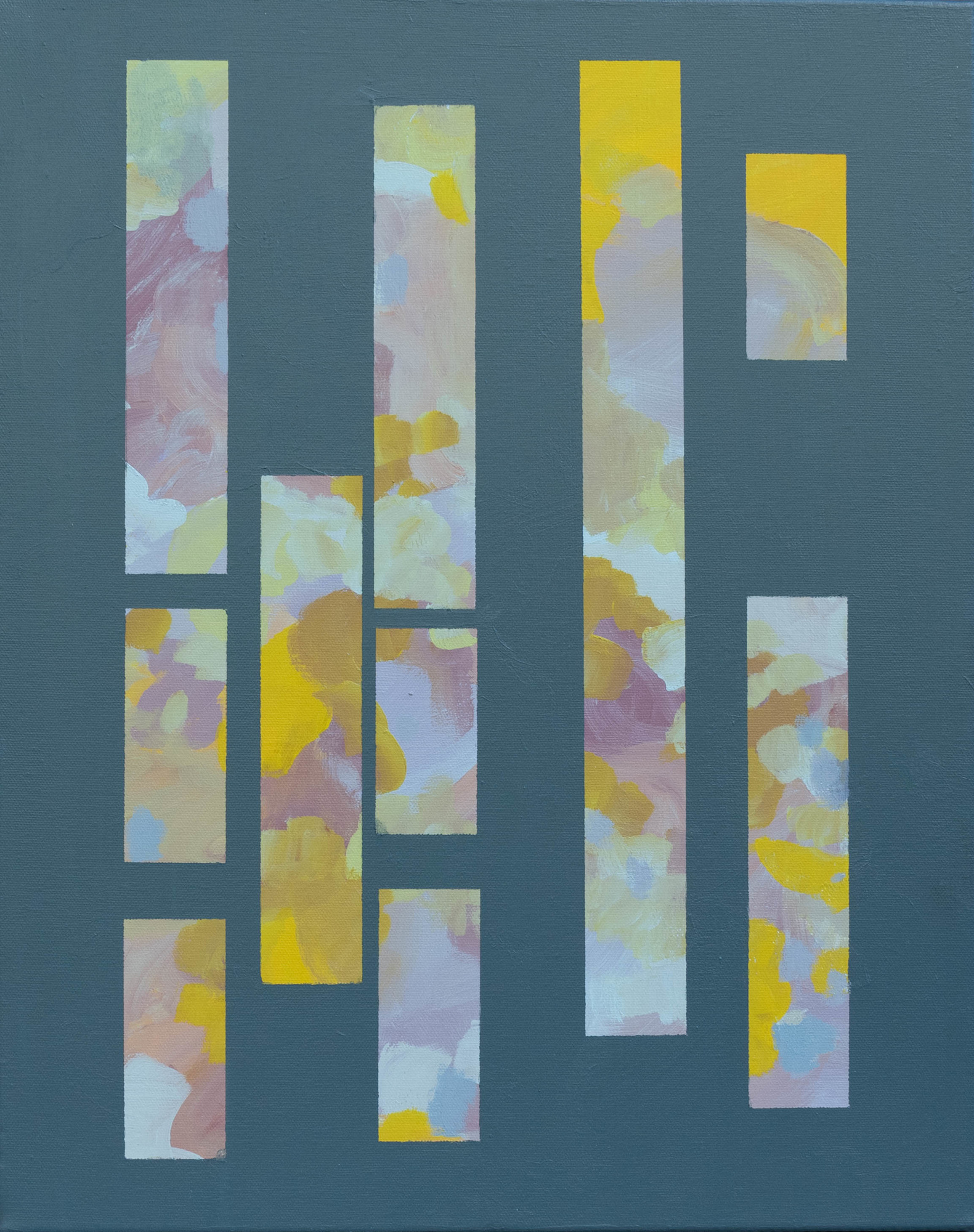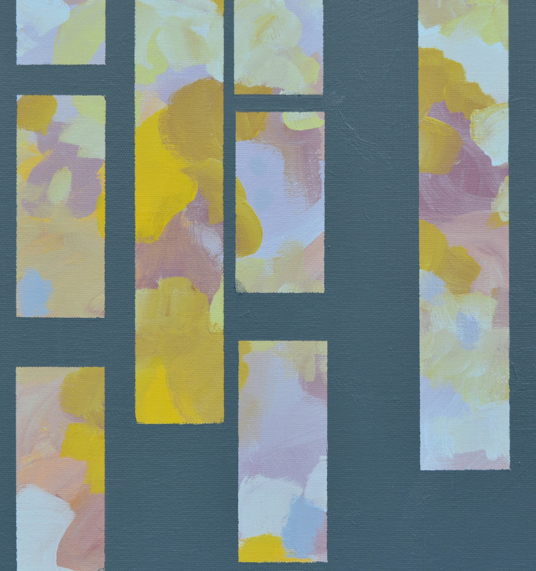 Rectangular forms hold lively brushstrokes in soft hues. Playful yet structured—like sunlight in rhythm.