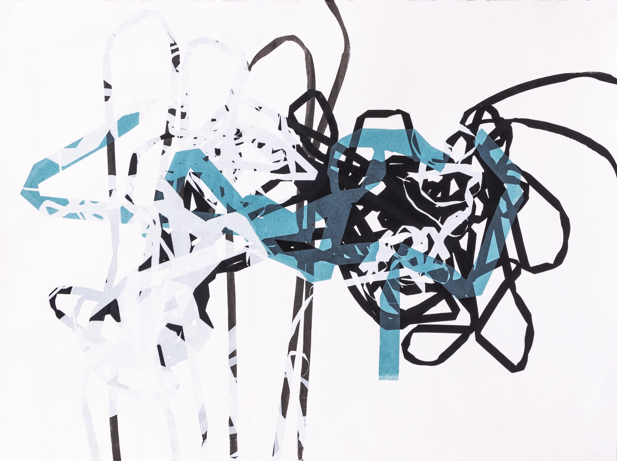 This abstract Screenprint was hand-printed using an improvisatory approach that did not rely on drawing, camera, or computer. The print was created using ribbons, light-sensitive emulsion, light, silkscreen, ink, and a squeegee. Each color is a unique exposure, a new screen, and a separate printing. It belongs to a series that is informed by a daily meditation practice started in 2020 as a response to the pandemic.