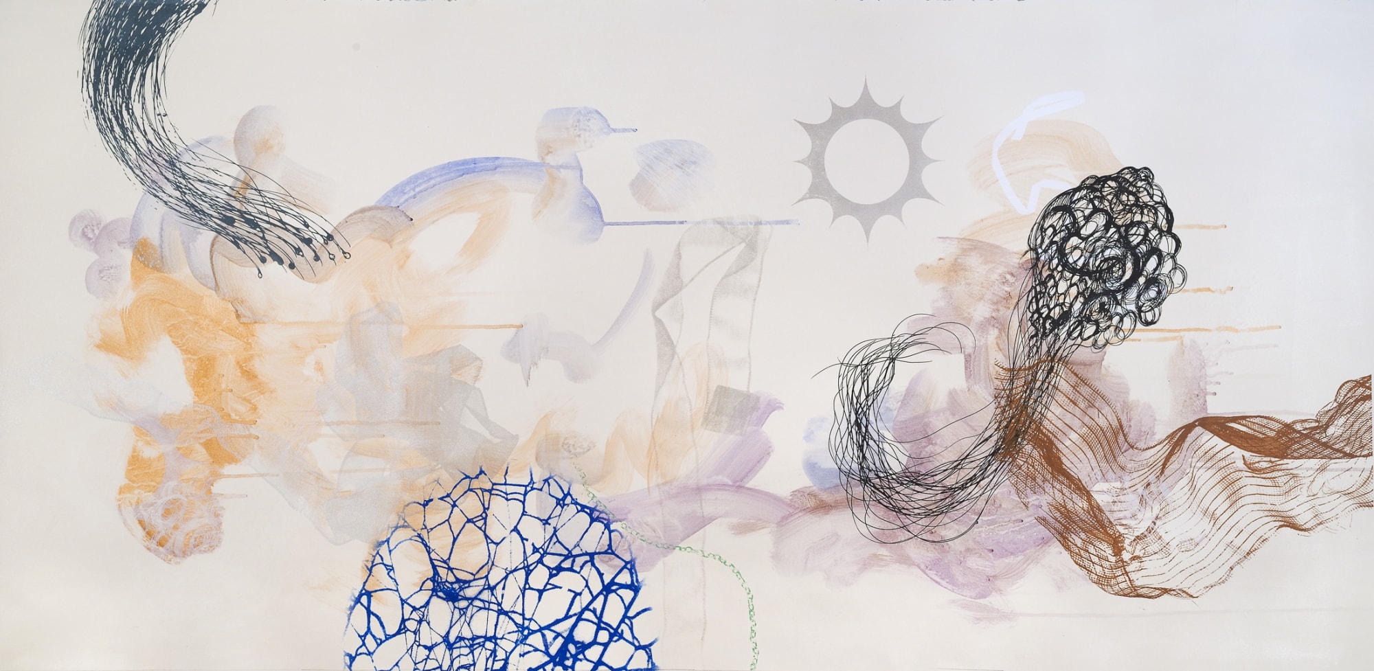 This mixed-media screenprint is part of a series exploring the earth as a sentient being. Set on a long horizontal format, the piece unfolds with overlapping, abstract imagery that evokes floating natural forms. The flowing and layered compositions create a sense of animation and movement, despite the two-dimensional surface. The work invites viewers to engage with the rhythms and vitality of the natural world in a dreamlike, meditative way.