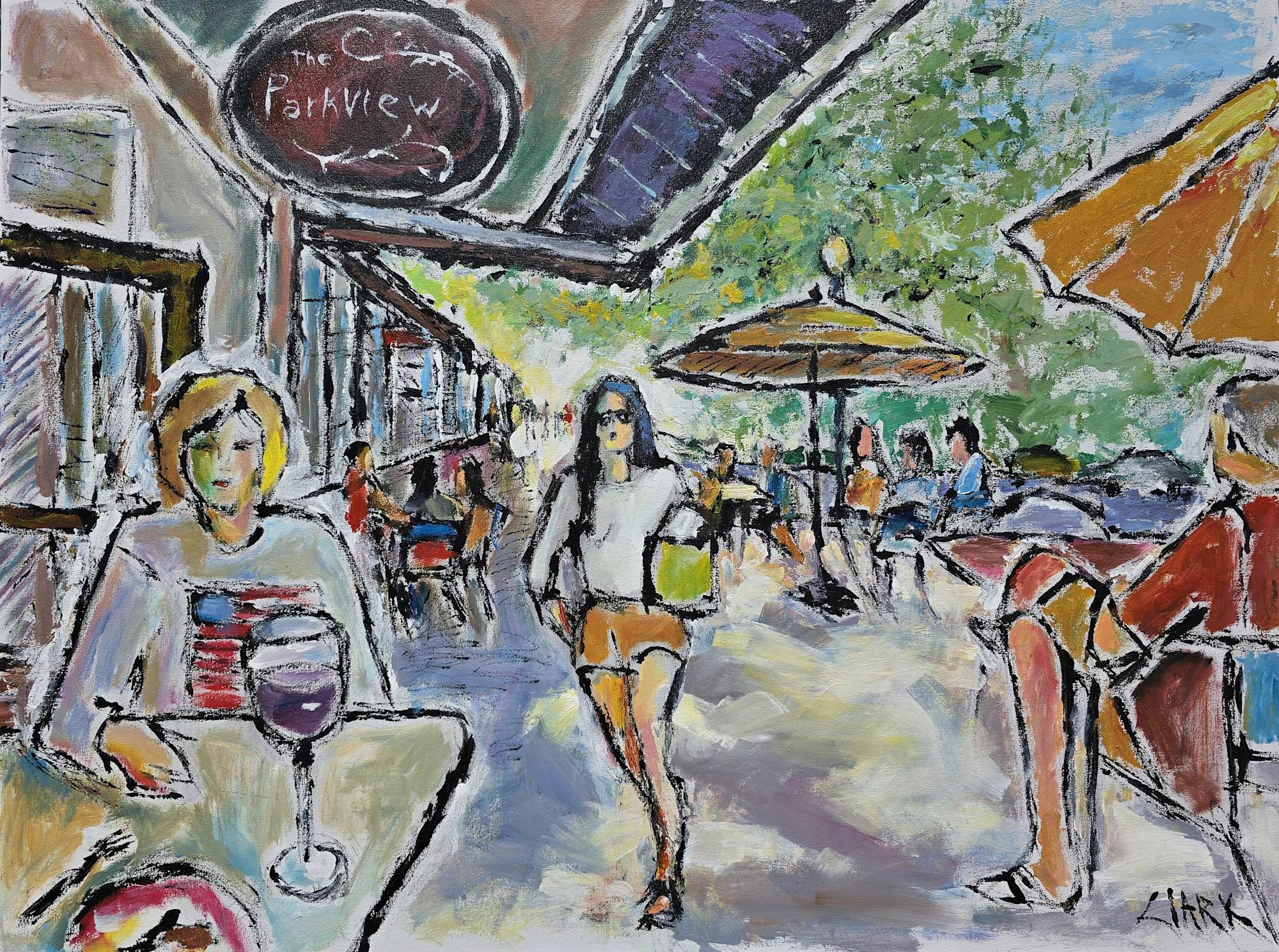 MessageThe painting, with its playful lines and forms, beautifully captures the charm of dining outdoors at one of Park Avenue's many eateries. The artwork features Judy, the artist's partner, positioned on the left enjoying the best views of the park. This piece is part of The Winter Park Collection.