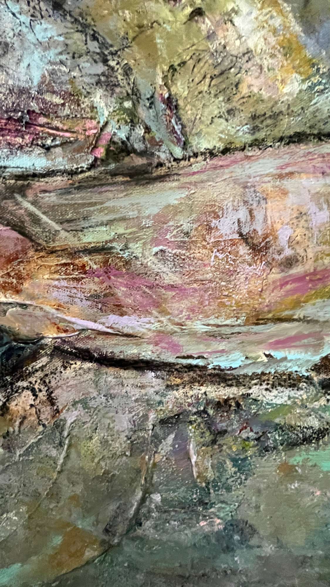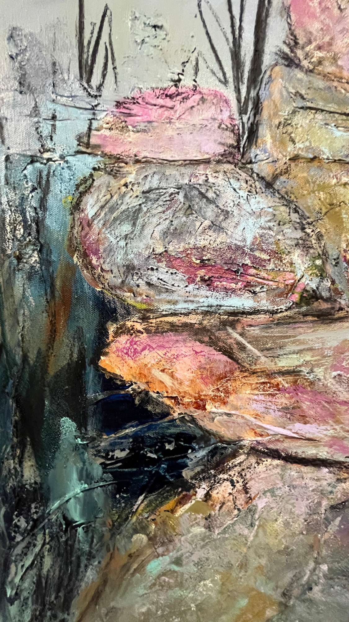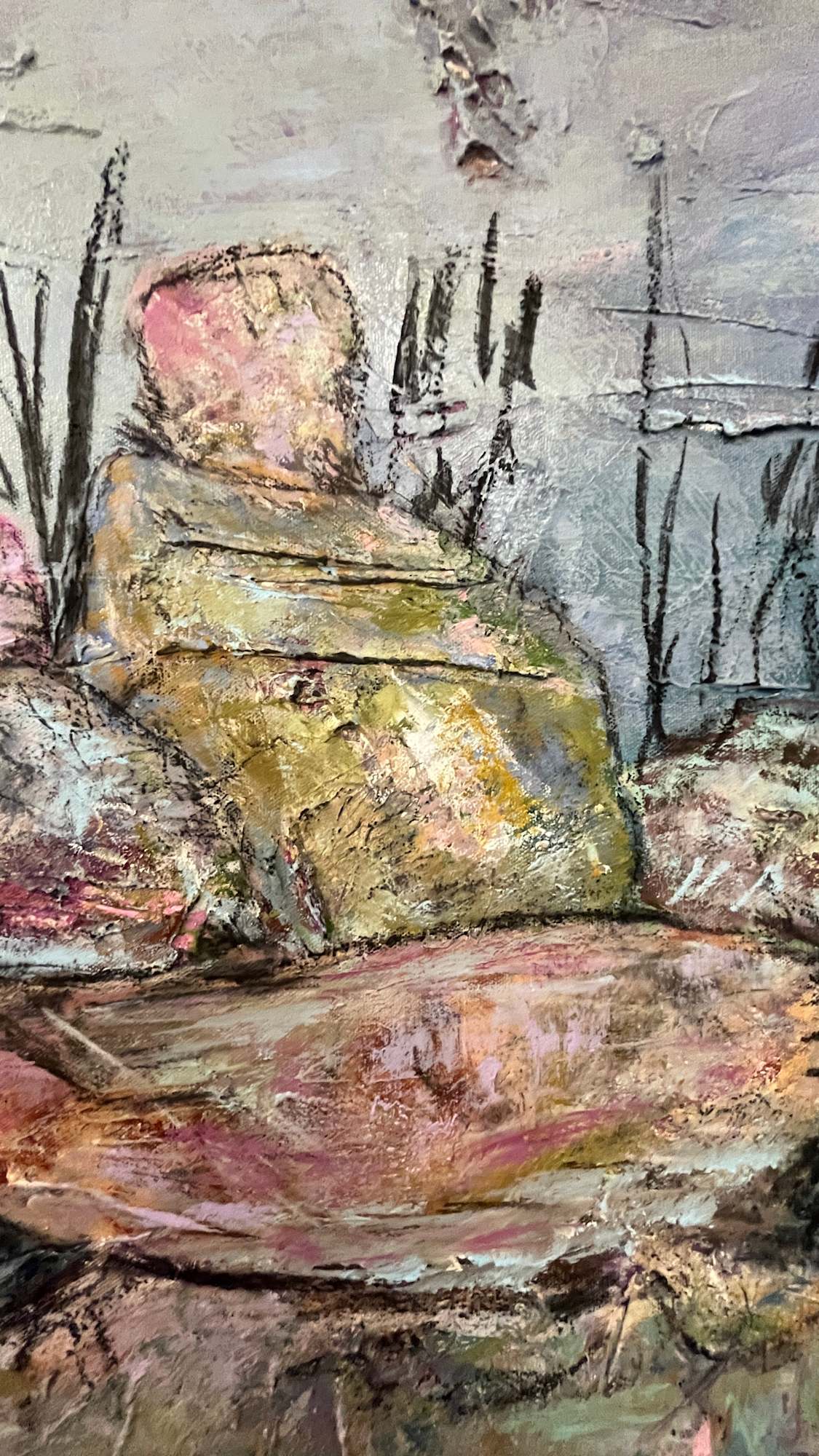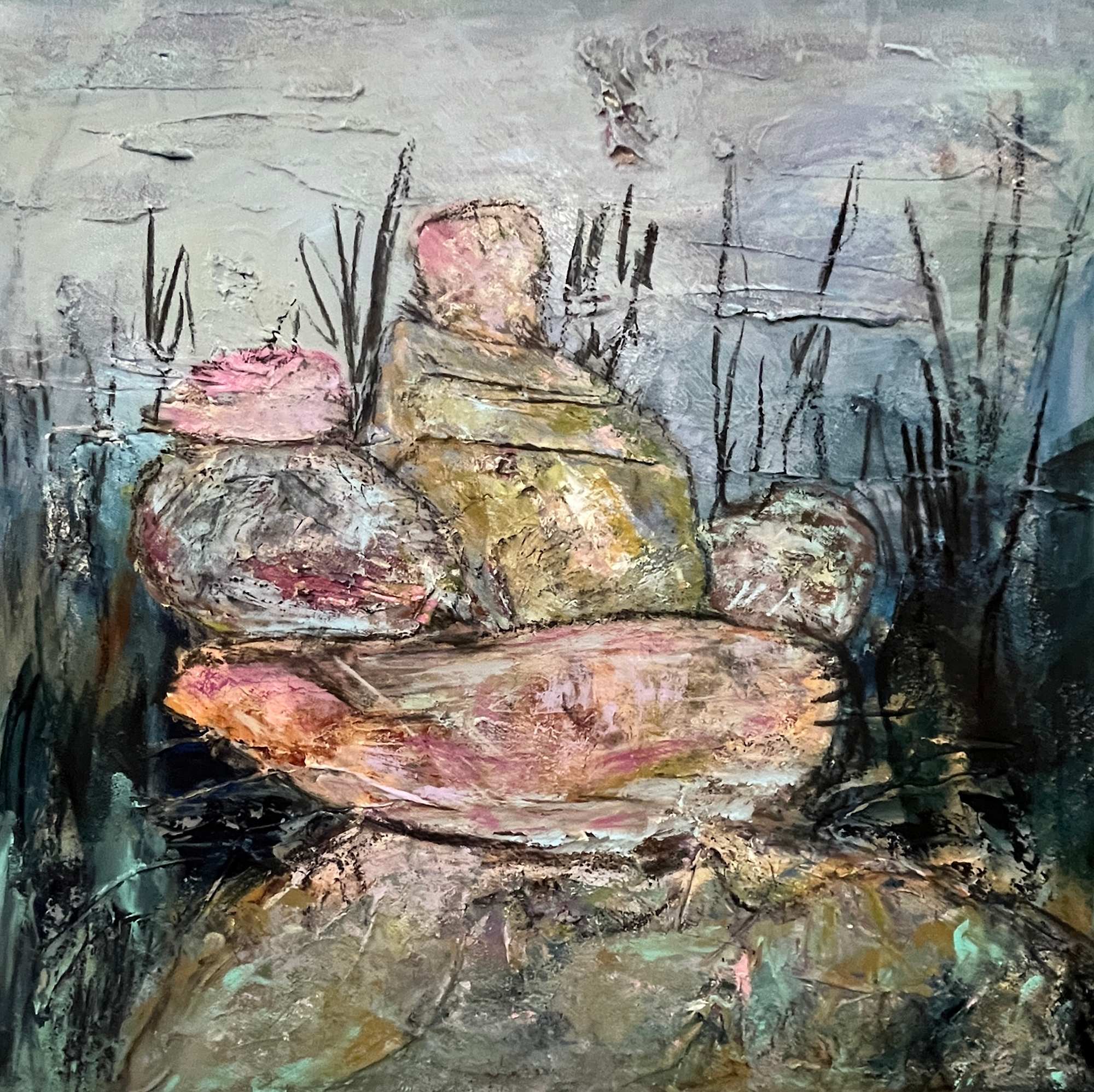 creating this piece, I drew upon a medley of materials—acrylic, pastel, charcoal, and oil pastel—to explore the contrast between the ephemeral and the enduring. The abstract yet figurative portrayal of stones stacked one atop another symbolizes balance and tranquility. With cool, soothing tones interspersed with raw textural strokes, this artwork invites a sense of peace and reflection, perfectly suiting any space that cherishes a moment of calm in the midst of everyday chaos.