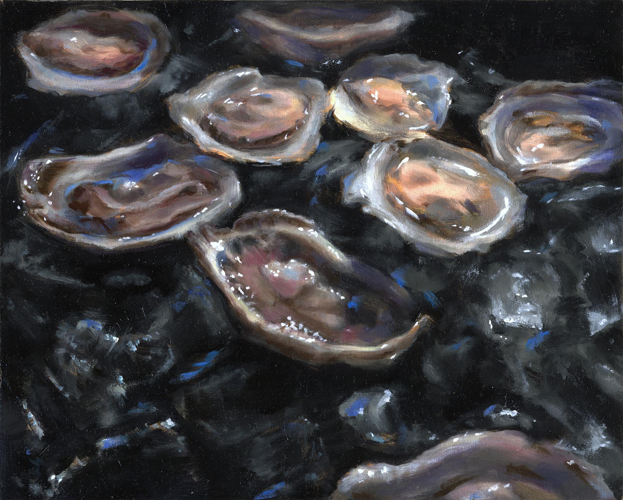 Oysters on ice, catching the flicker of lantern light on a summer night. The mix of brine, melting ice, and shadow feels both simple and ritualistic—something fleeting but worth pausing for.