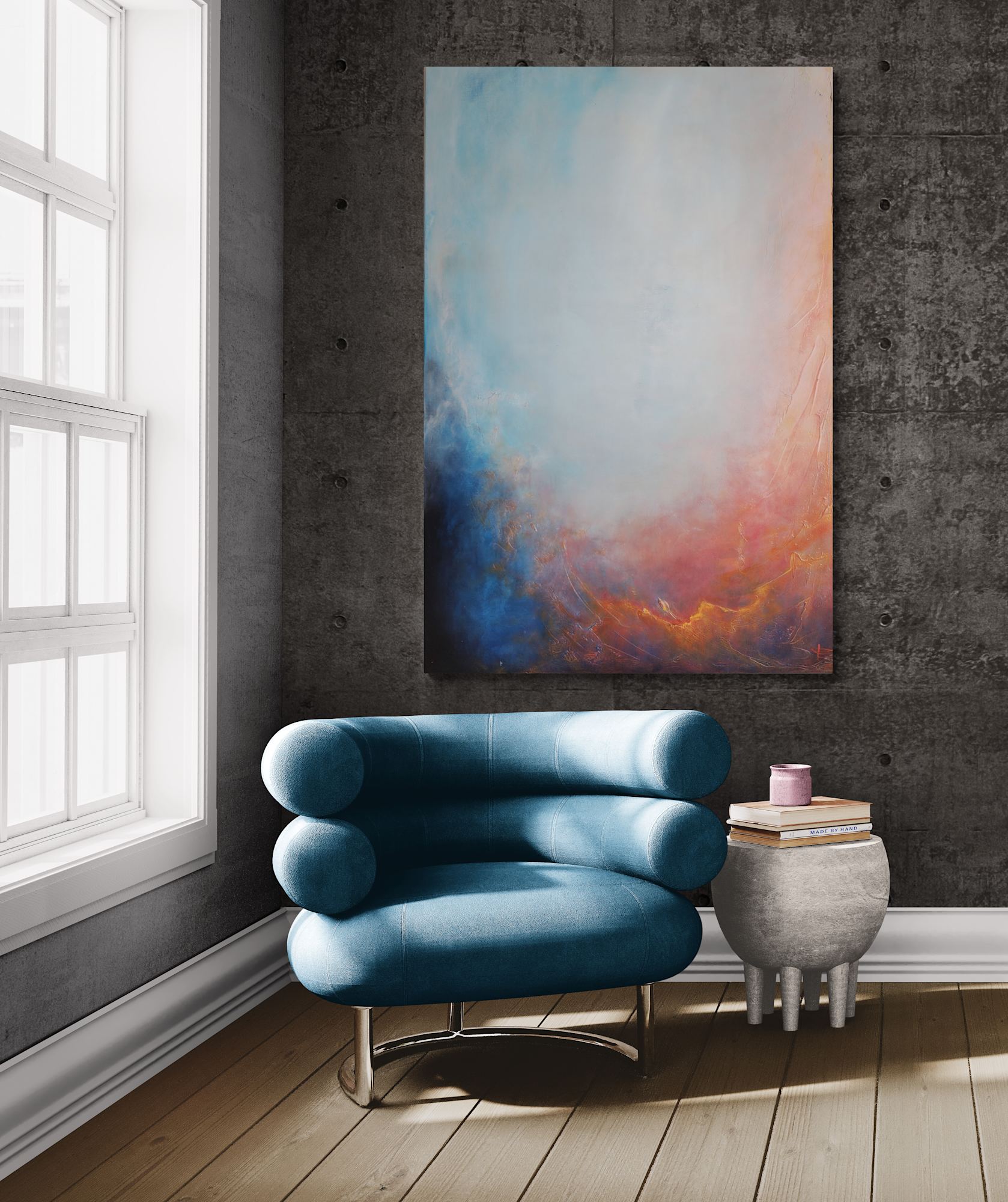 Intrigued by the light refracting through mist on a cool autumn morning, Diffuse III was painted to capture the atmospheric and ethereal glow juxterpositioned against bright sunlight light cutting through the soft mist. Soft blending of blues is complimented by warm tonal details enhancing strong textural elements.