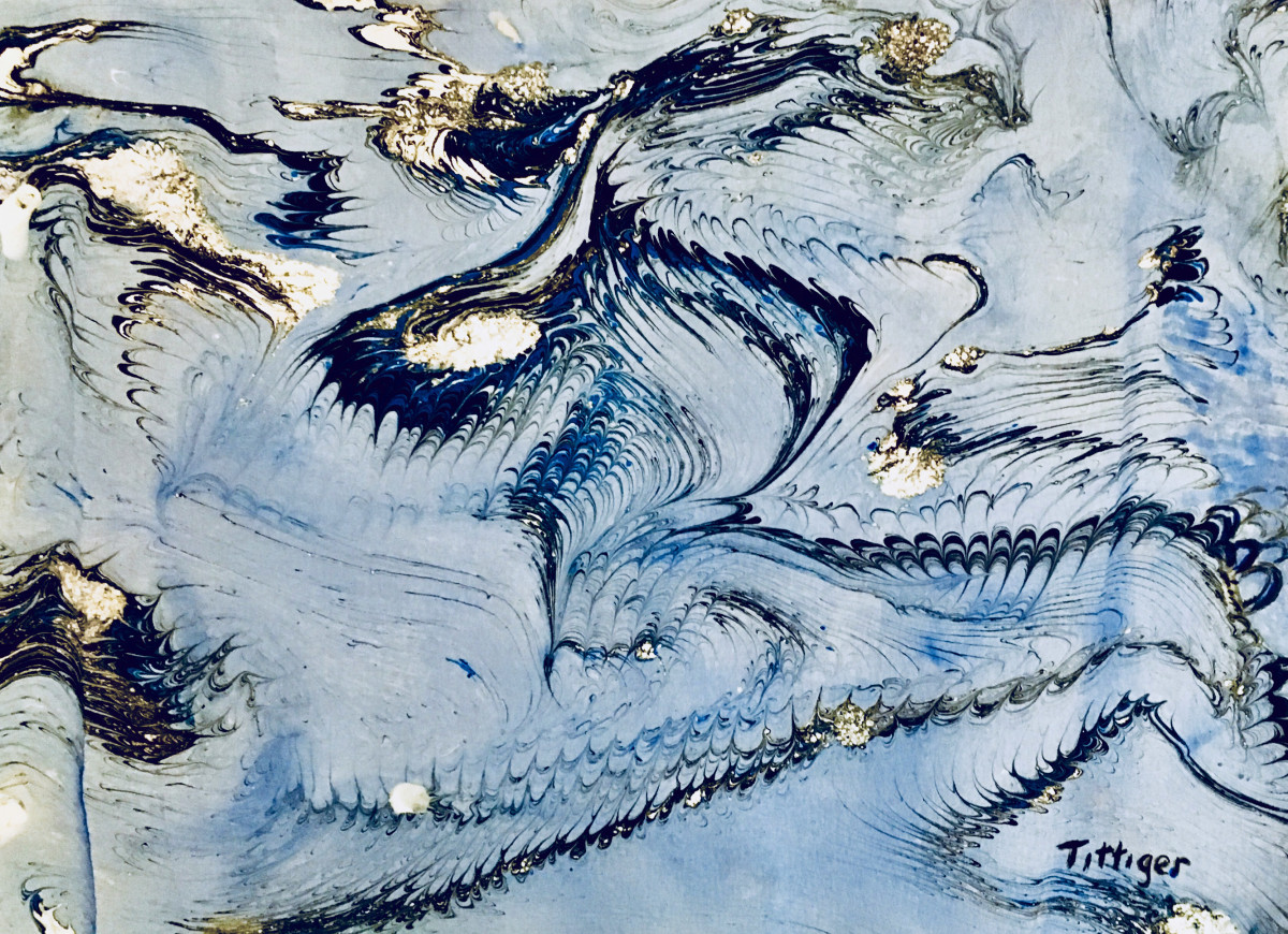 This is an acrylic marbling that looks like a comb or feathers through it. It is very vibrant blue.