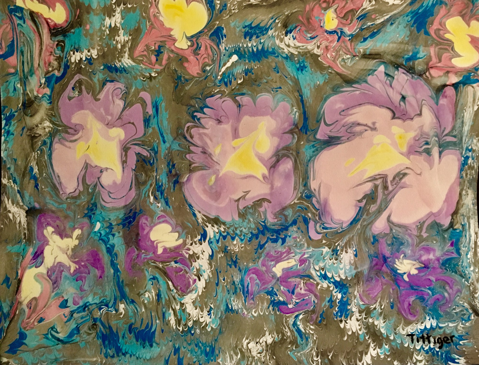 This is an acrylic marbling ready to be matted and framed. My father loved several different flowers. Irises are part of that group. He had purple irises all around the house.