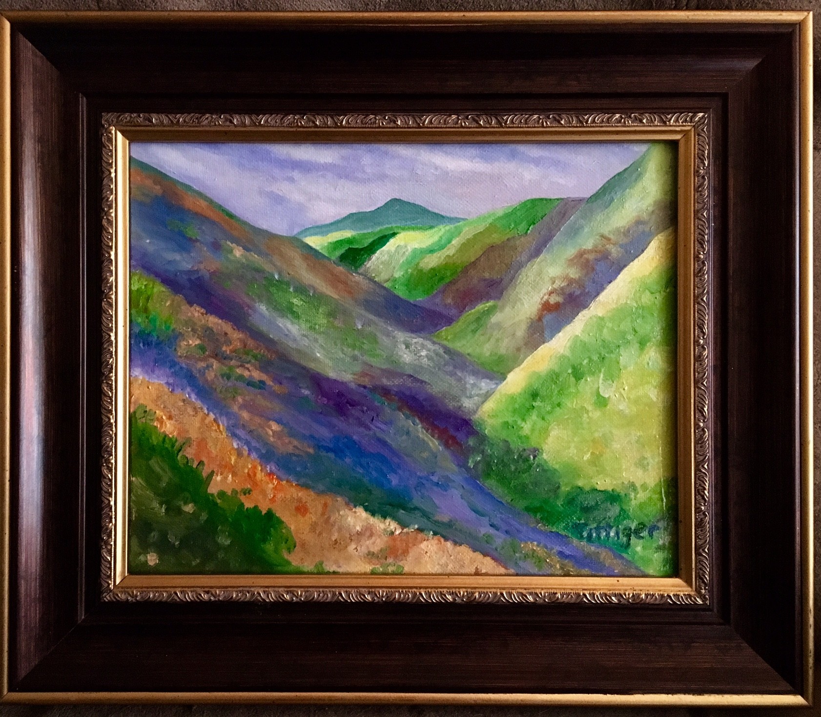 This is an Oil painting of a photograph. I made it more impressionistic. It is a scene of hills and Heather growing on the hillsides. It reminds me of my daughter. The piece is framed.