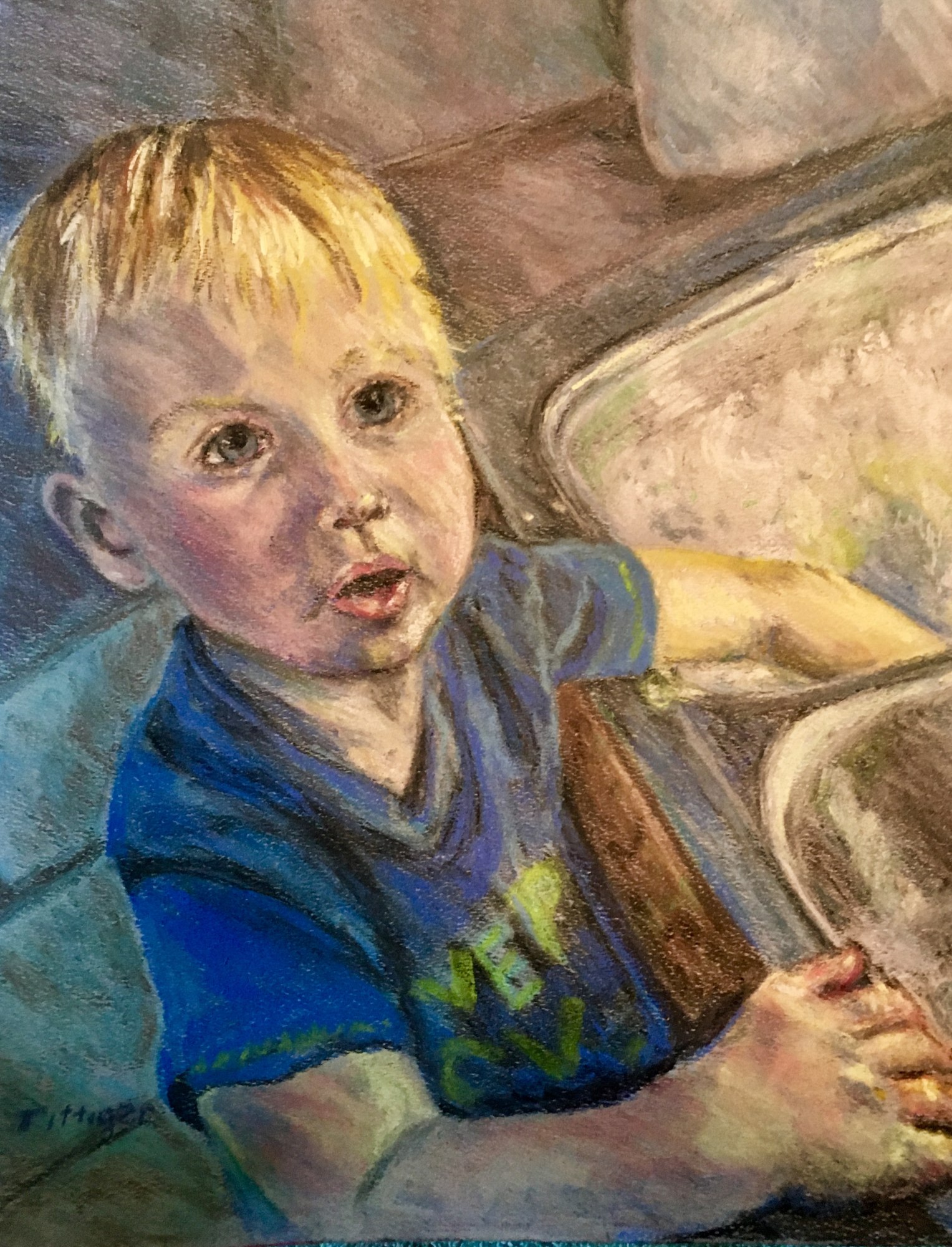 This is a pastel painting of my grandson. He gets so excited to do dishes. He always asks "Grandma I do dishes?"