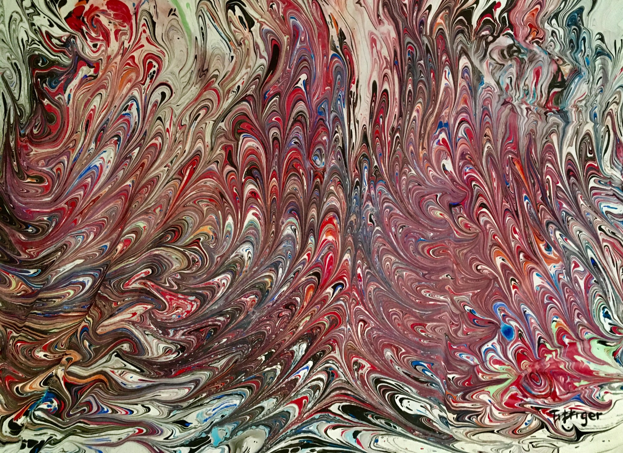 This is an acrylic marbling ready to be matted and framed. It has multiple colors throughout, hence the name.