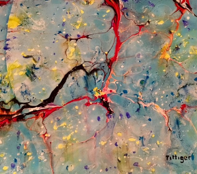 This is an acrylic marbling that is matted and framed. The mat is a deep blue that matches the darkest blue in the picture and the frame is black. This painting reminded me of a Japanese painting, therefore it is called the Orient.