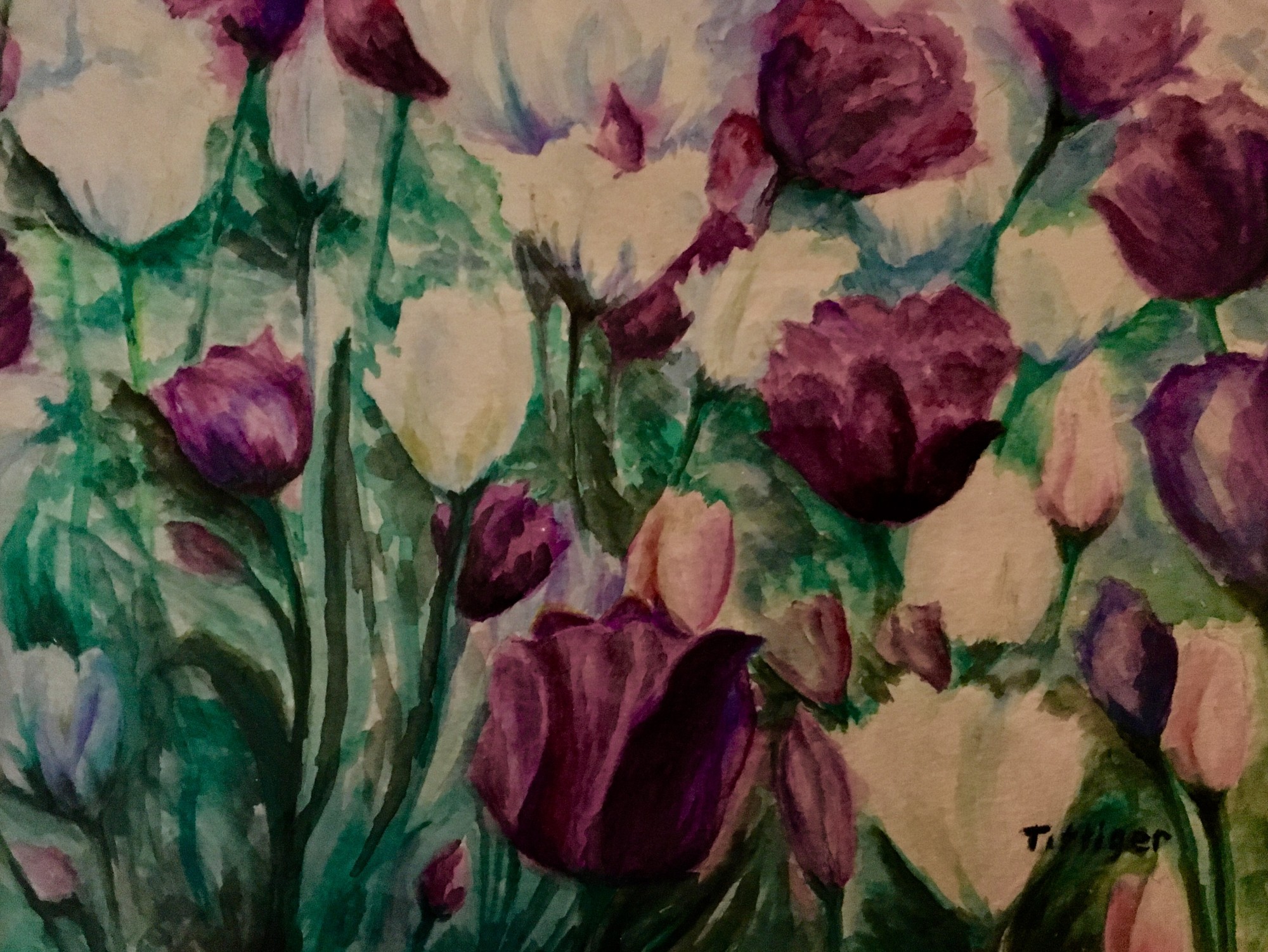 This is a watercolor of pretty tulips. The piece is matted and framed.