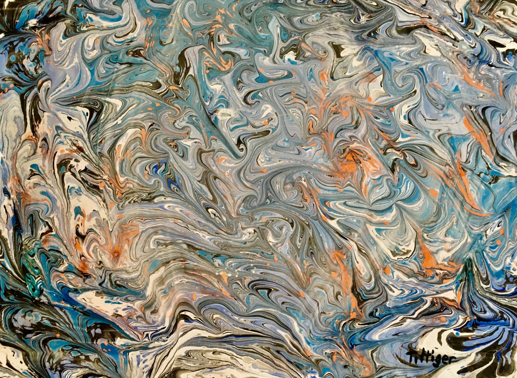 This is an acrylic marbling ready to be framed. It has just enough orange to set off the blue.