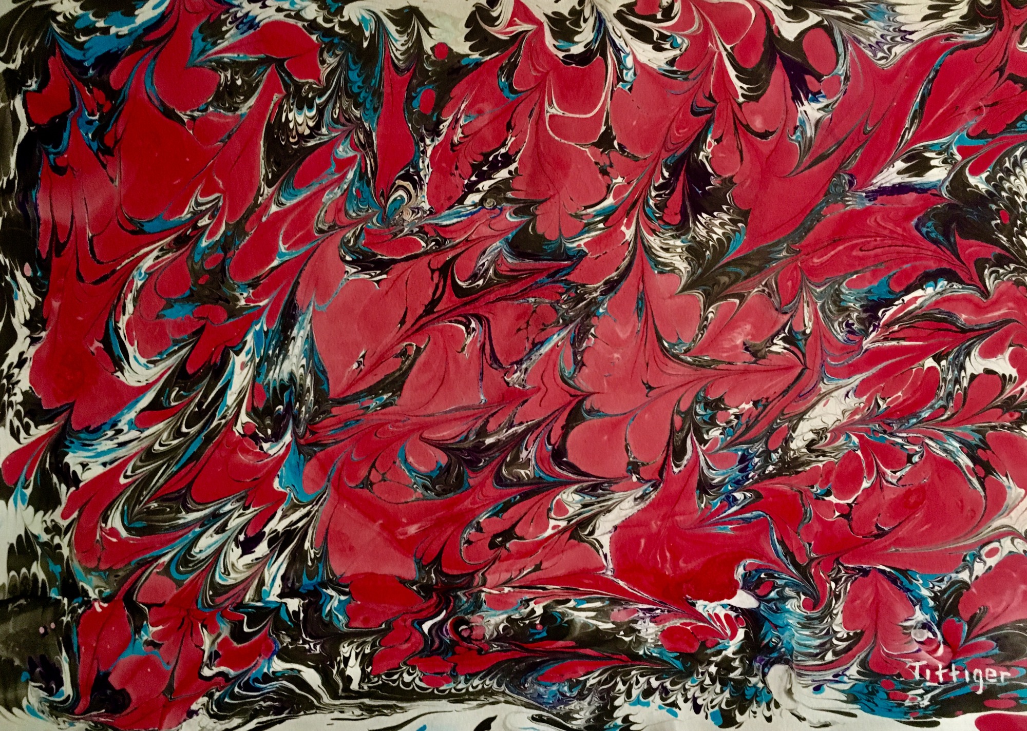 This is an acrylic marbling ready to be matted and framed. It also has a touch of blue throughout the piece.