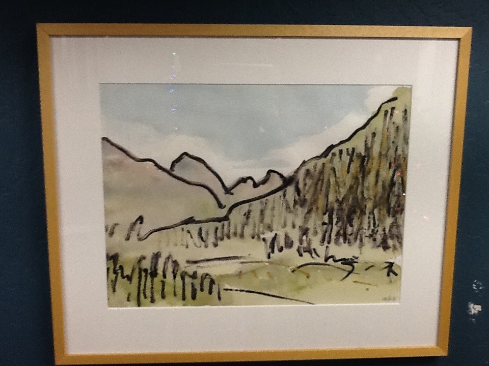 Framed watercolor painting with tan wood frame with white matting. Mountain valley landscape with green meadow, black/brown lines representing trees in the foreground. The closest mountain is covered in trees, while the two grey peaks in the distance do not have trees. The sky is light blue, and is white closest to the peaks.