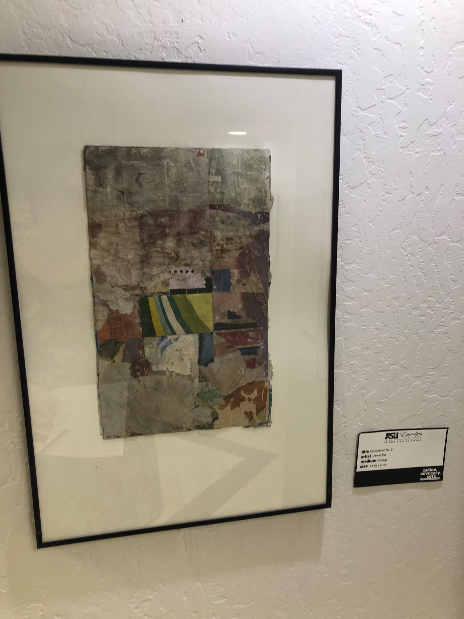 Framed collage with thin black metal frame with white matting. Recycled paper collage in muted red and aged white. In middle of work, striped fabric, colors from left to right: black, red, light blue, navy, white green red, yellow. In bottom right corner, red splotch.