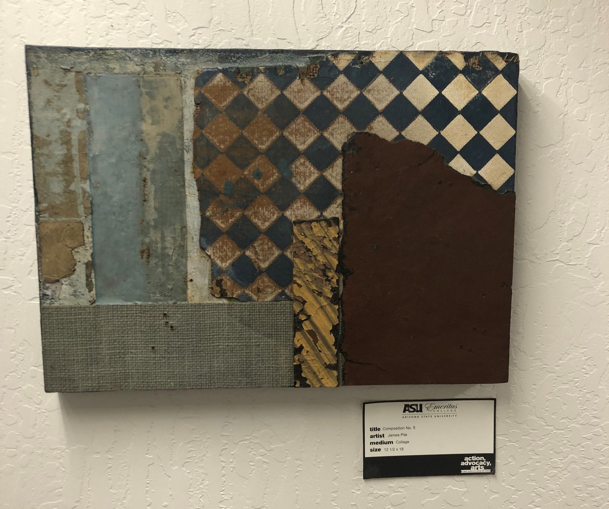 Unframed on wood with navy side border. Layered collage with varied textured and treated materials cut unevenly: blue and white checkered material, discolored towards the middle, burnt red material on bottom right corner, light blue linen on bottom left corner, other materials and colors, including tan, light blue, and white fabrics.