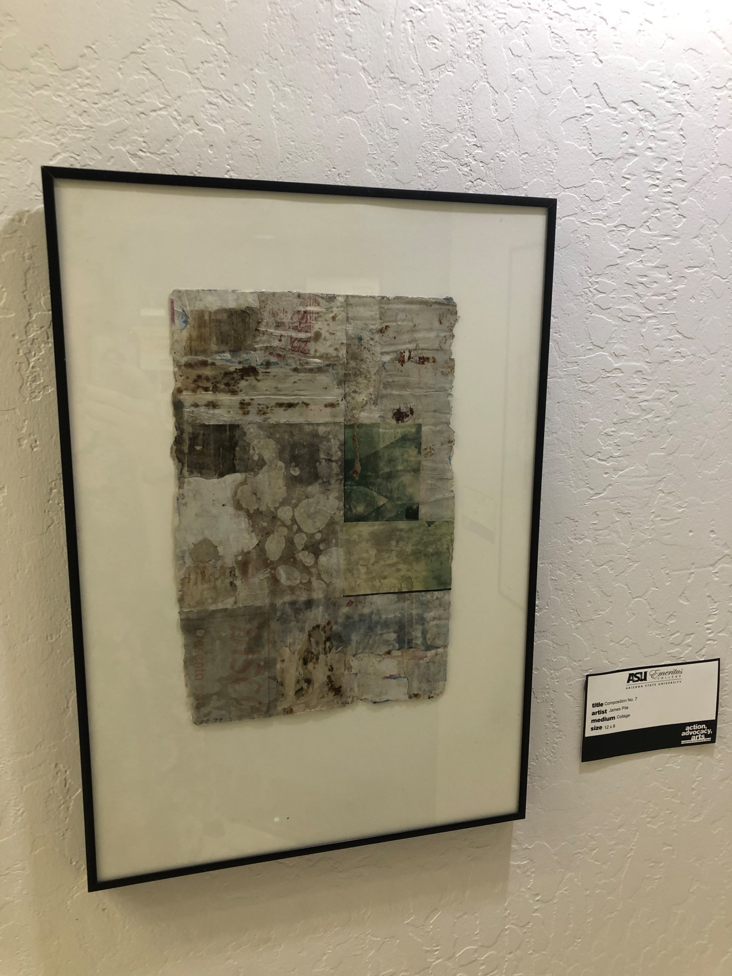 Framed collage with thin black metal frame with white matting. Recycled paper collage in faded neutral colors. Bottom left corner has text which reads: Disco. Sections are lightly burned and have water splotches.