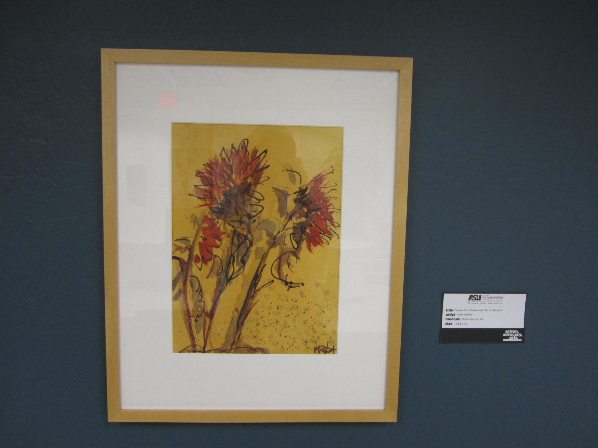 Framed painting with tan wood frame with white matting. Red sunflowers on olive green stalks, outlined in black on a mustard background. Speckled in the bottom right corner, with artist's initials.