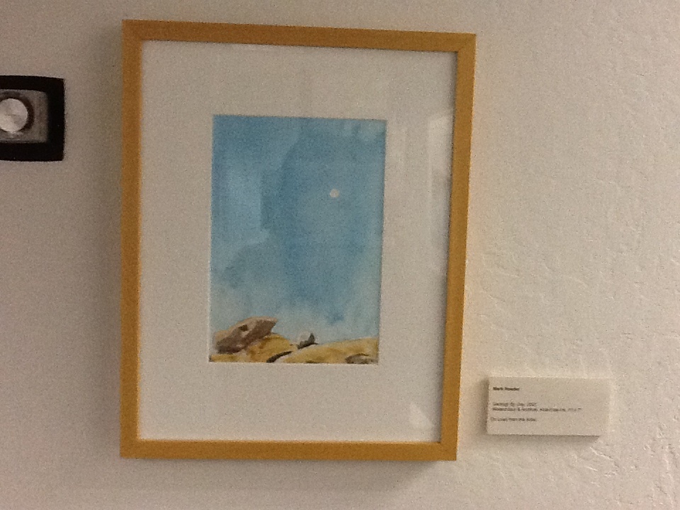 Framed painting with tan wood frame with white matting. The bottom of the work has tan and brown shaded boulders and rocks (5). The sky is light blue and takes up 90% of the work with a small white circle for the sun.