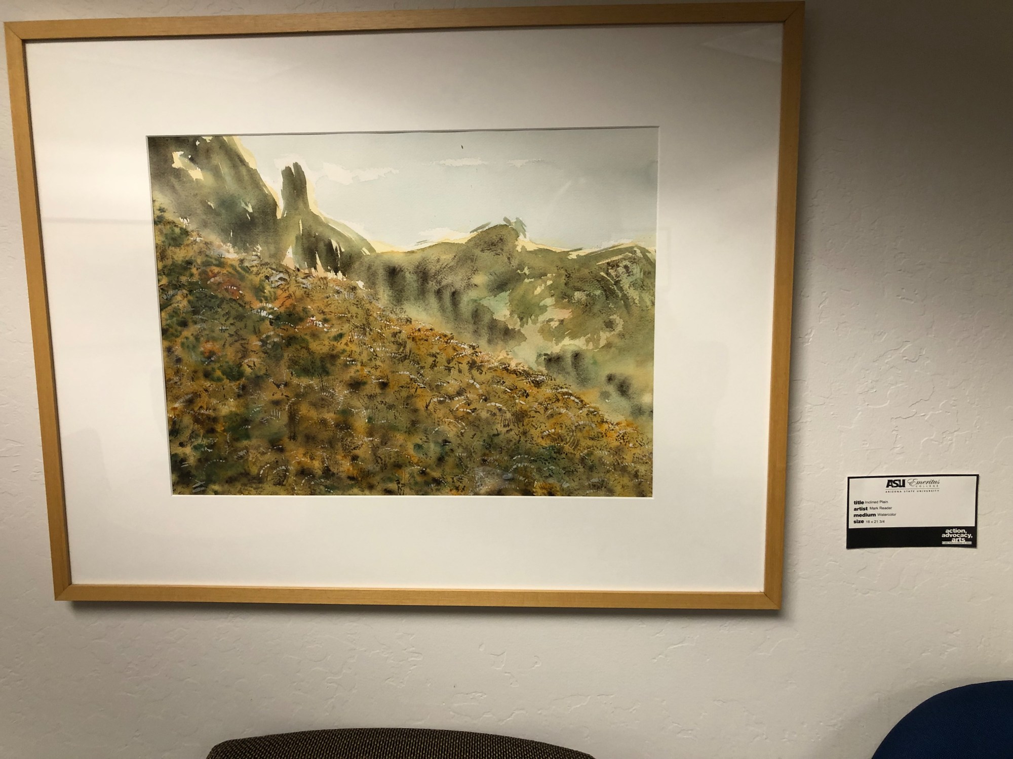 Framed painting with tan wood frame with white matting. Green, yellow and brown brush hilly desert scene in the foreground. Middle ground features another green hill with less detailed plants. background has silhouette of grey mountain with whitish sky.
