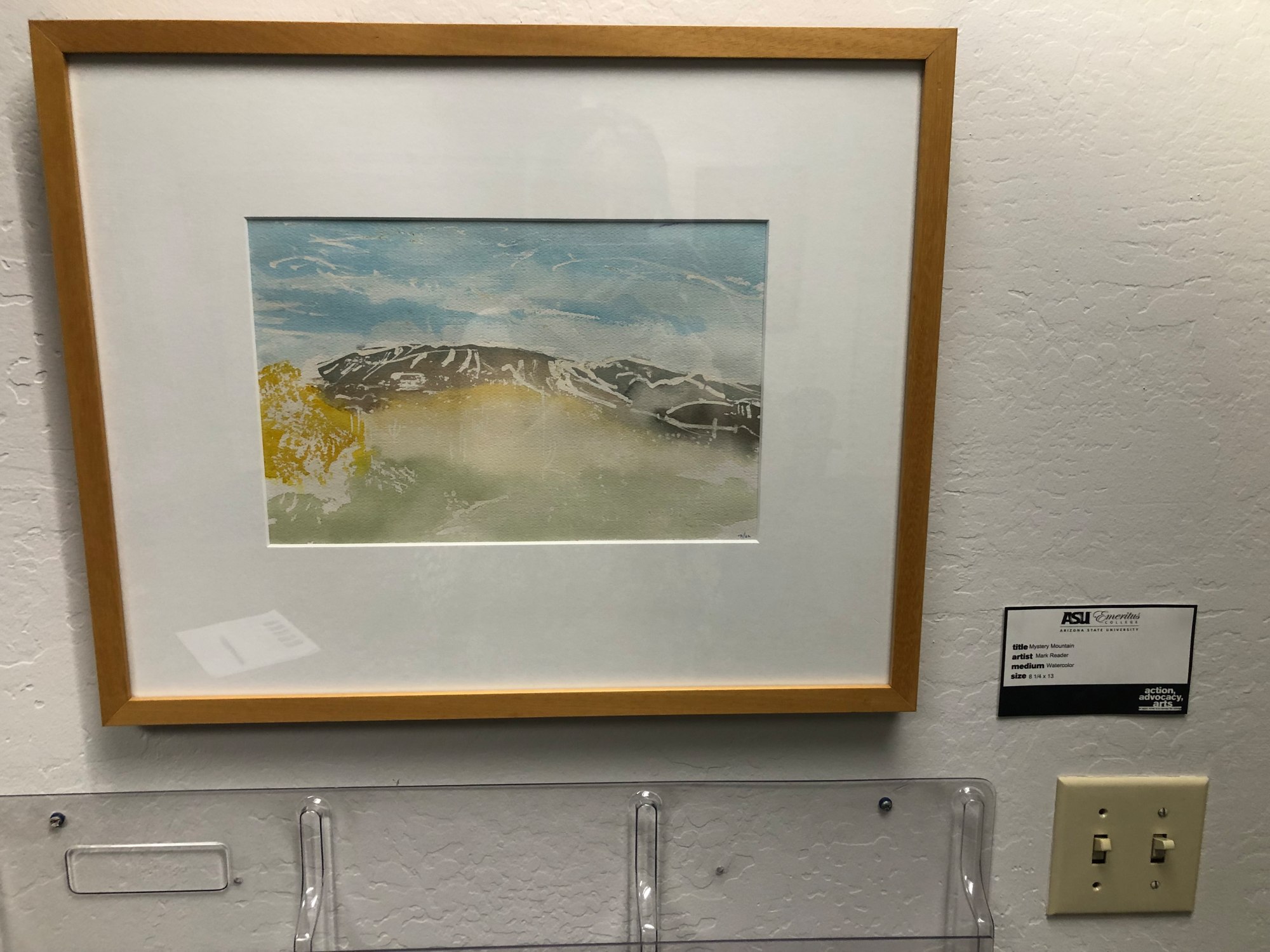 Framed painting with tan wood frame with white matting. Prairie landscape with light blue sky. Middle horizon, focus is on prairie and the grey/brown flattish mountain with white outlines. Blended light green grassland region in foreground with yellow foliage on the left side.