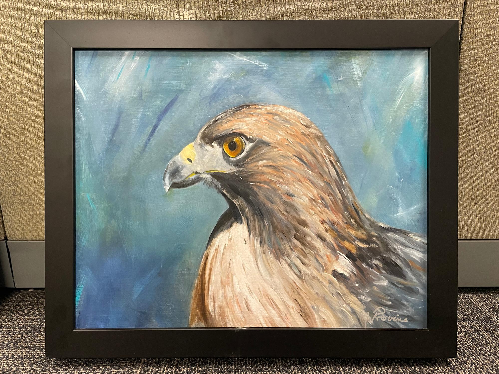 A red-tailed hawk, with eyesight better than any human's, stands ready to fly.