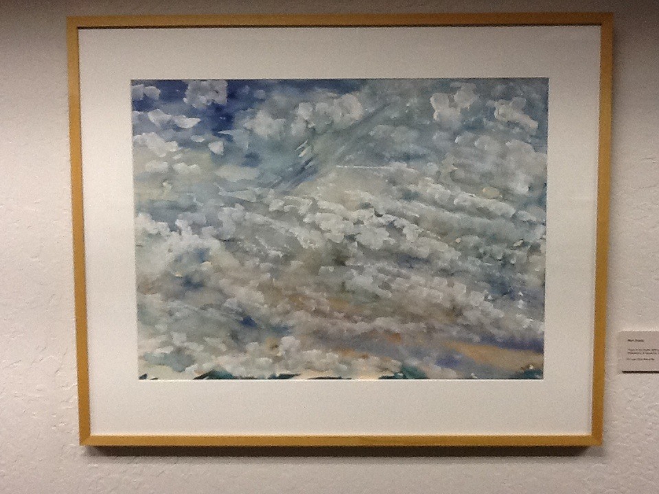Framed painting with tan wood frame with white matting. Skyscape with a tiny bit of silhouetted land in the bottom of the work, focus is on the fluffy clouds in white over various shades of blue and a bit of yellow perhaps showing sunlight.