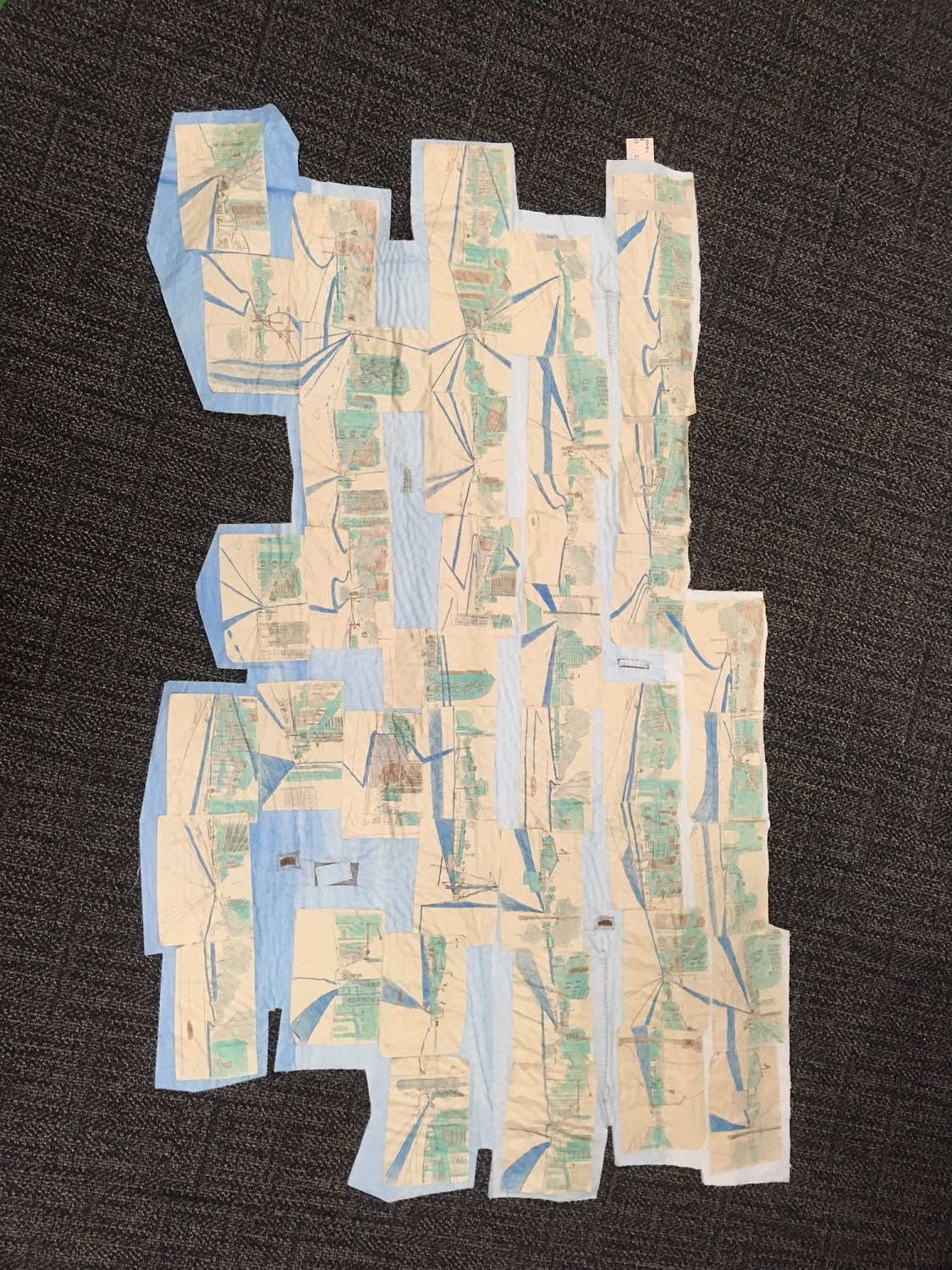 Artist's Statement: I expanded the concept of My Beautiful City into an unframed hand-quilted plane. The fabric is hand-dyed, the choice of colors is specifically limited. Each of the scenes is a photo i took of the city I've made my own. Representative not only of the successes but of the failures to create connectivity and cohesion. Areas are distressed and damaged and then repaired. Touching the piece is permitted.