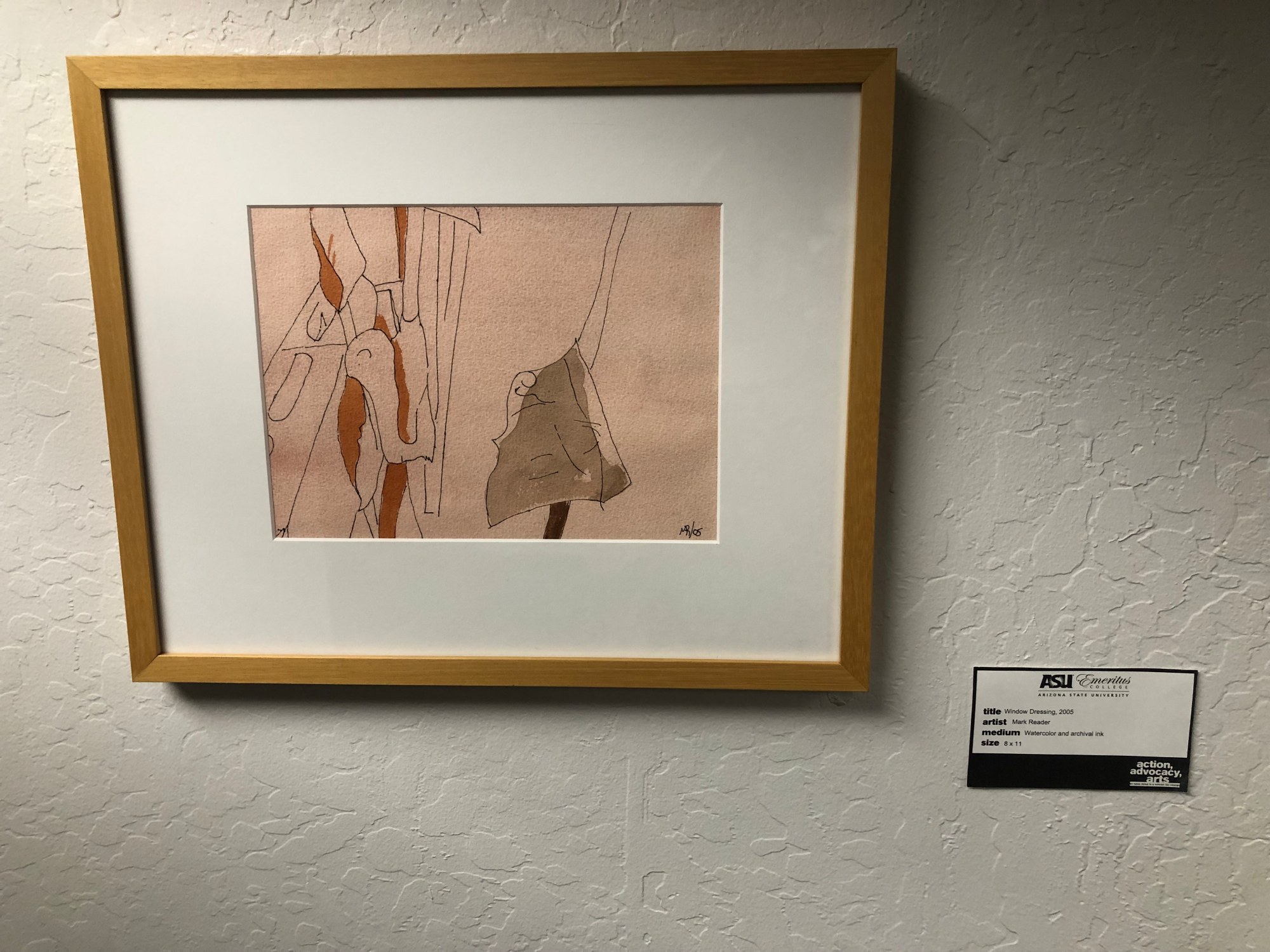 Framed watercolor and ink painting with tan wood frame with white matting. Abstract scene with light pink matte background, and black ink outlines of unknown subject, with red and light and dark brown fill in some of the shapes.