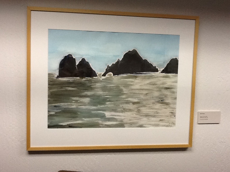 Framed painting with tan wood frame with white matting. Watercolor seascape with brown/black matte monolith rocks in the background with light blue sky. Sea water in greenish/grey/taupe in the foreground. High horizon.