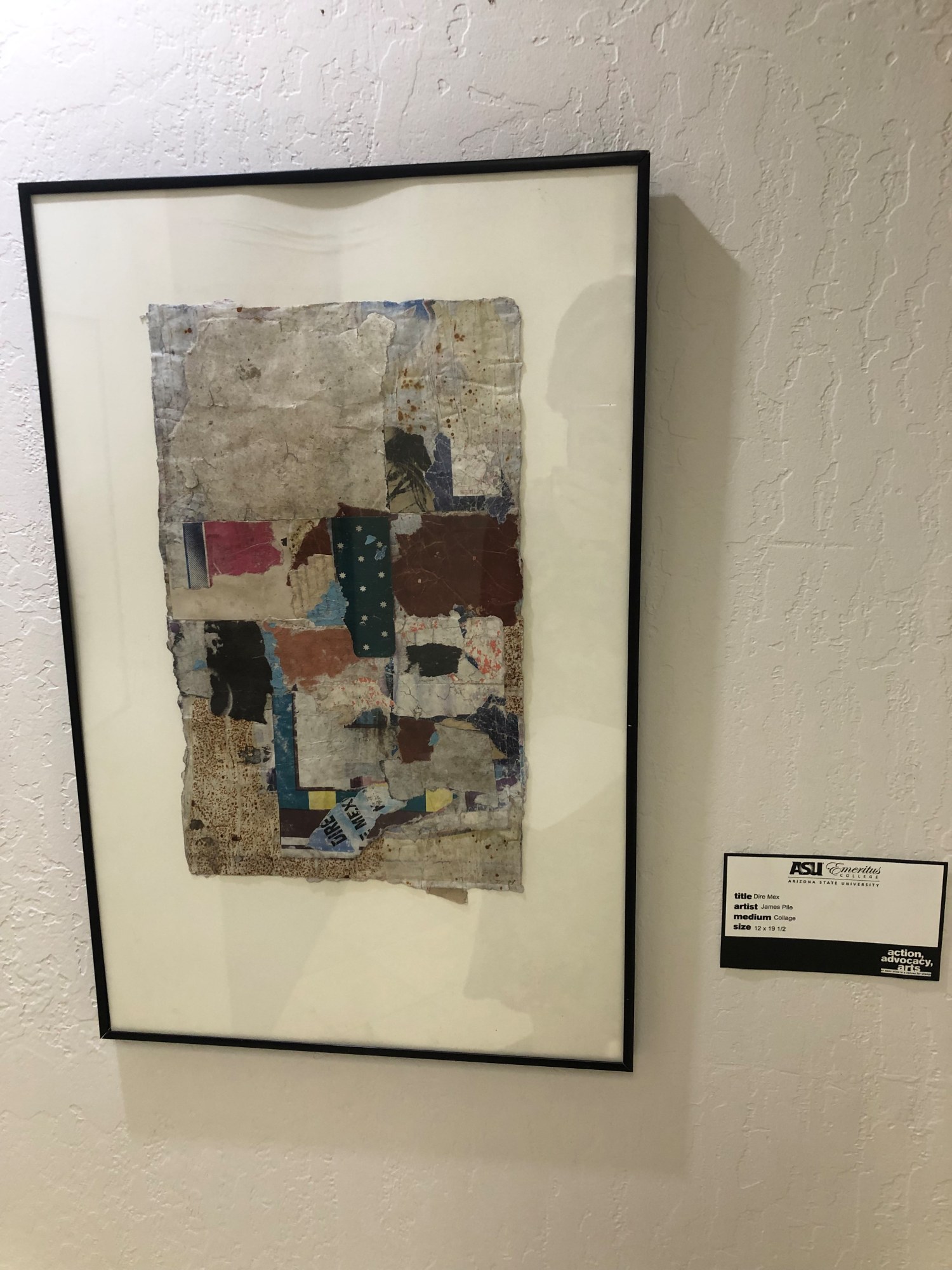 Framed collage with thin black metal frame with white matting. Recycled paper collage in muted white with sections of bright colors. Navy and white polka dot material in middle of work, between bright pink and red materials. Bottom middle has text which reads: dire mex.