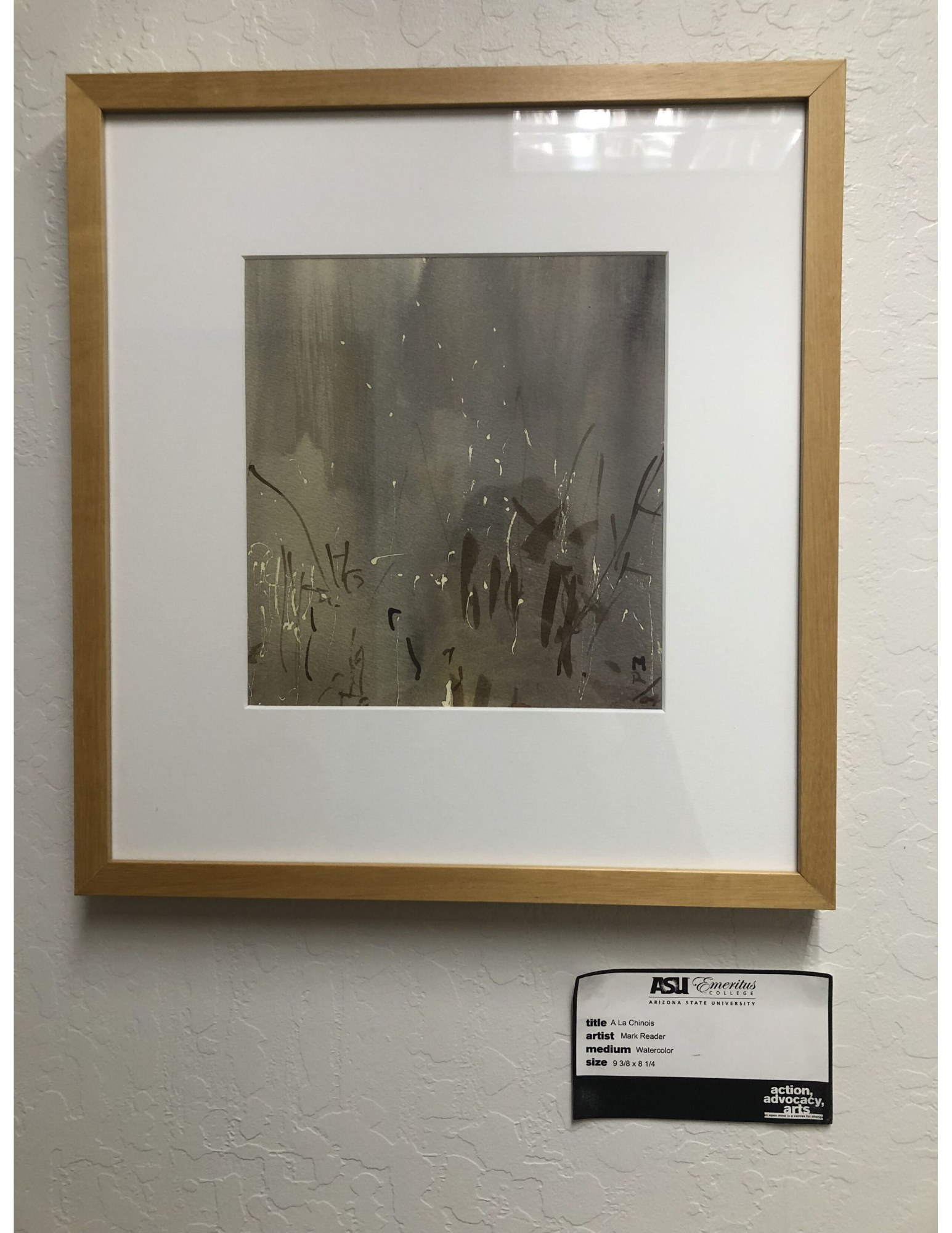 Framed painting with tan wood frame with white matting. Abstract landscape with grey background with brown, black, and white brushstrokes representing flora or fauna on the lower half of the work and white small dots throughout. Perhaps an homage or reference to Chinese landscape.