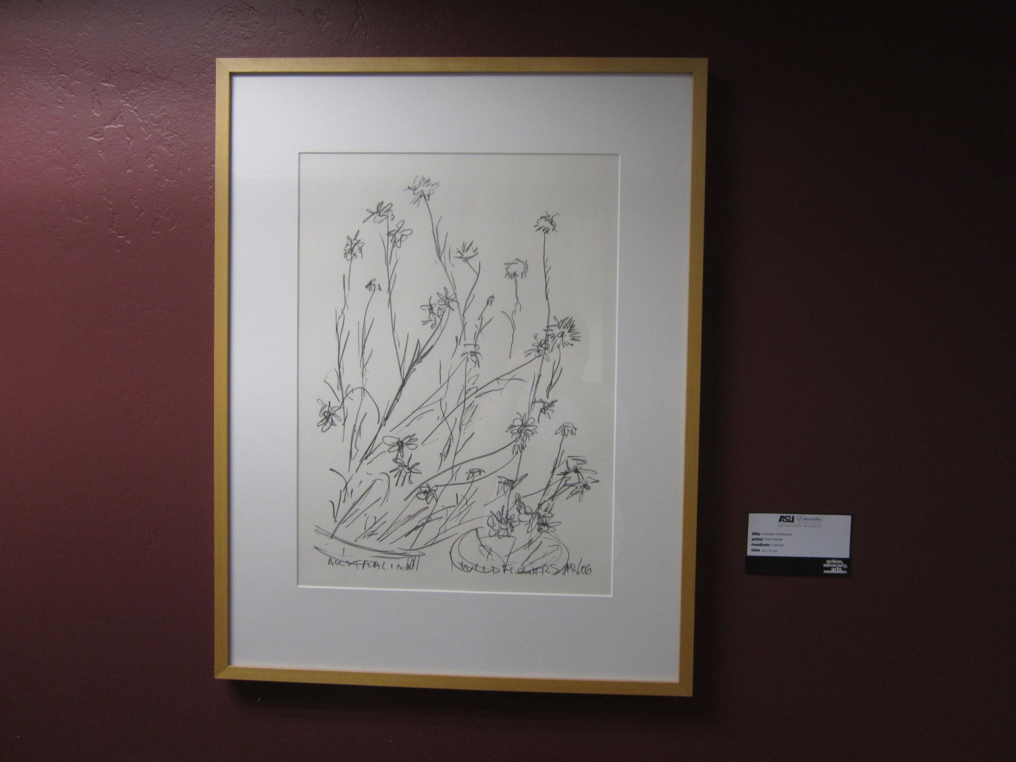 Framed drawing with tan wood frame with white matting. Charcoal drawing of wildflowers, with text at bottom reading: AUSTRALIAN WILDFLOWERS MR/06.