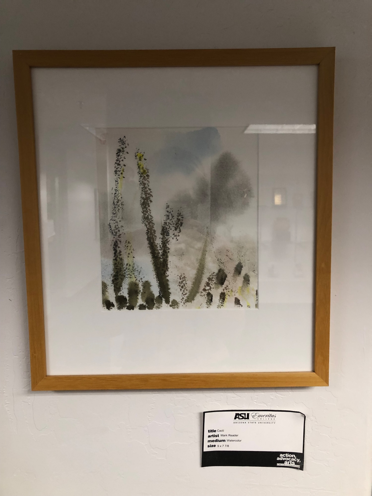 Framed watercolor painting with tan wood frame with white matting. Long and short green brushstrokes in the foreground perhaps represent organ pipe cacti, with grey and blue cloudlike regions on a white background.
