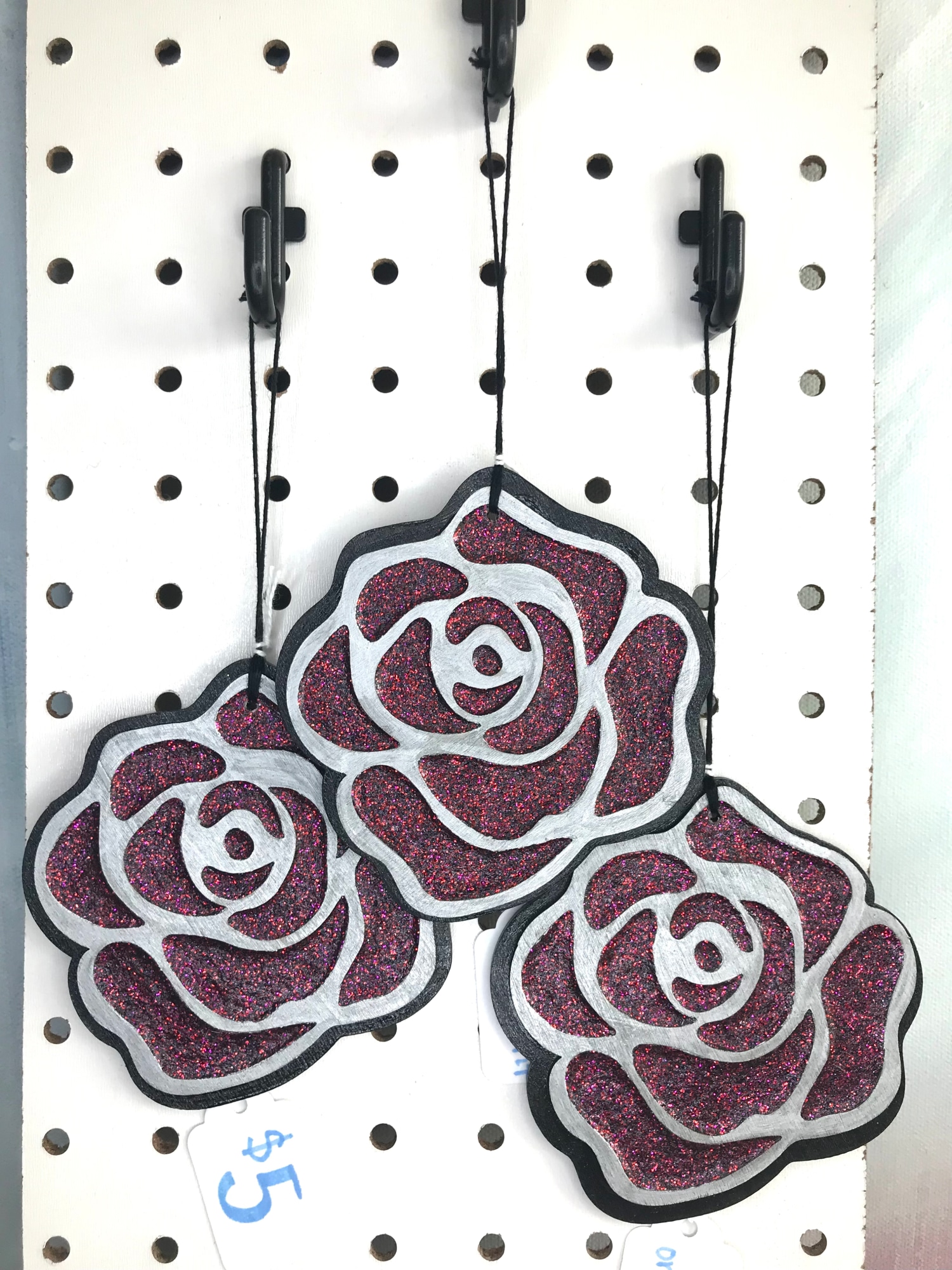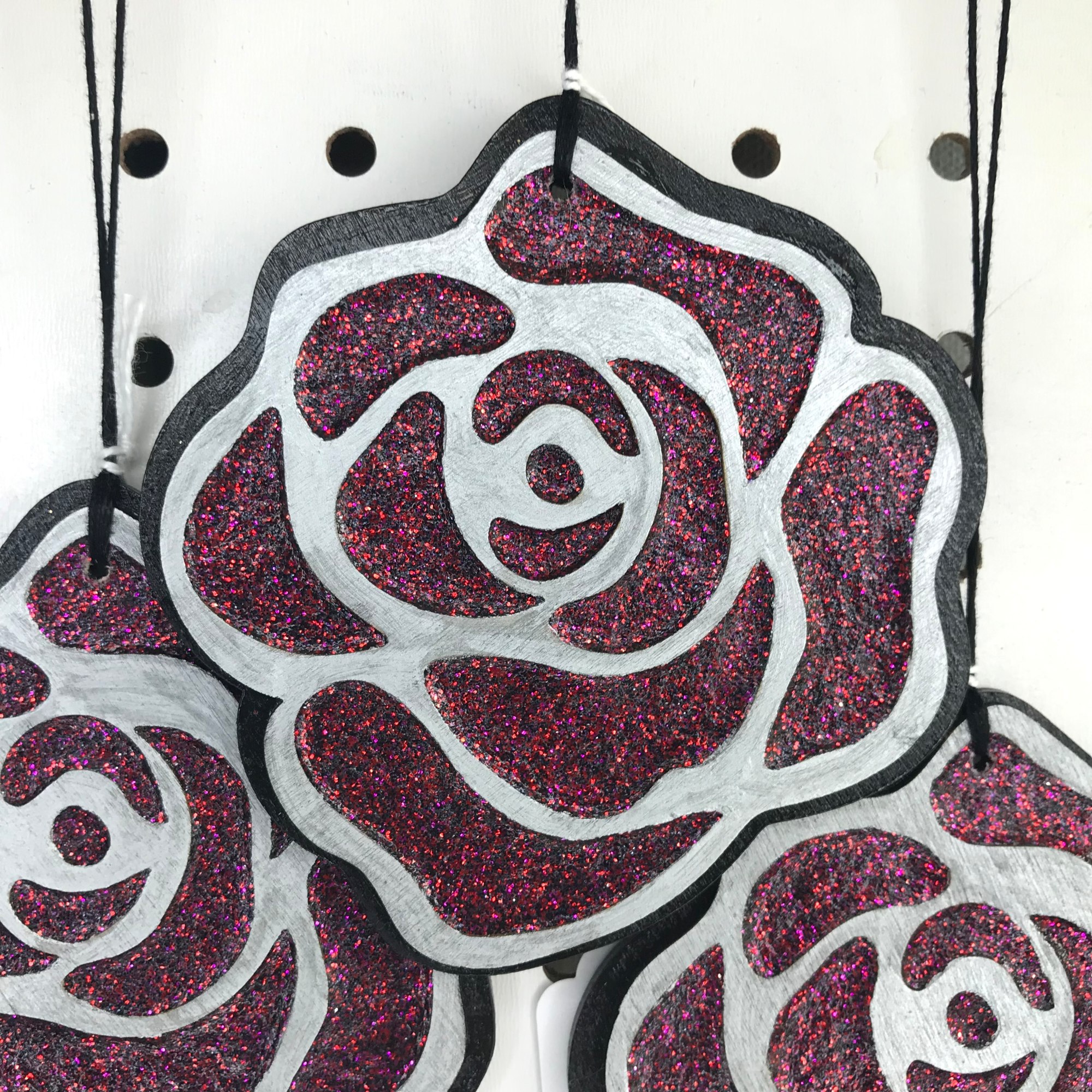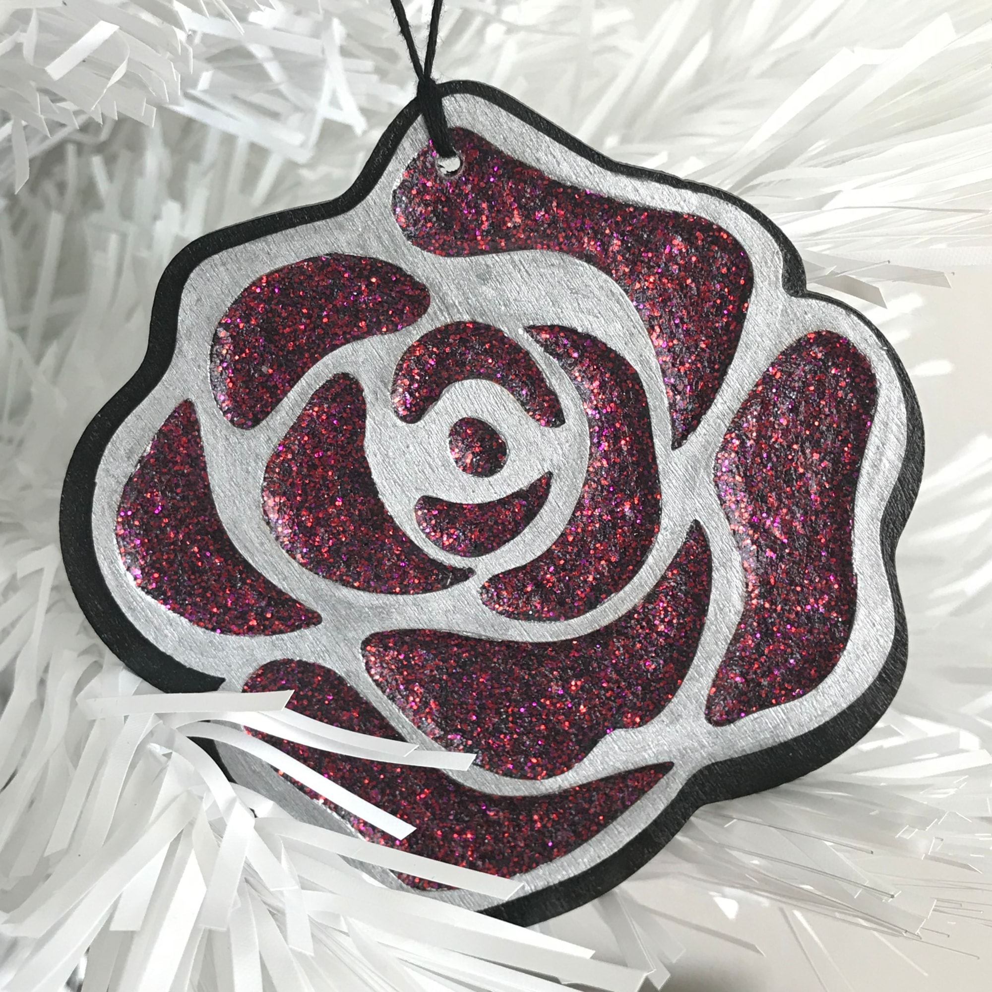 Three available. Wood rose ornament with deep red glitter petals, accented in silver with a black background.