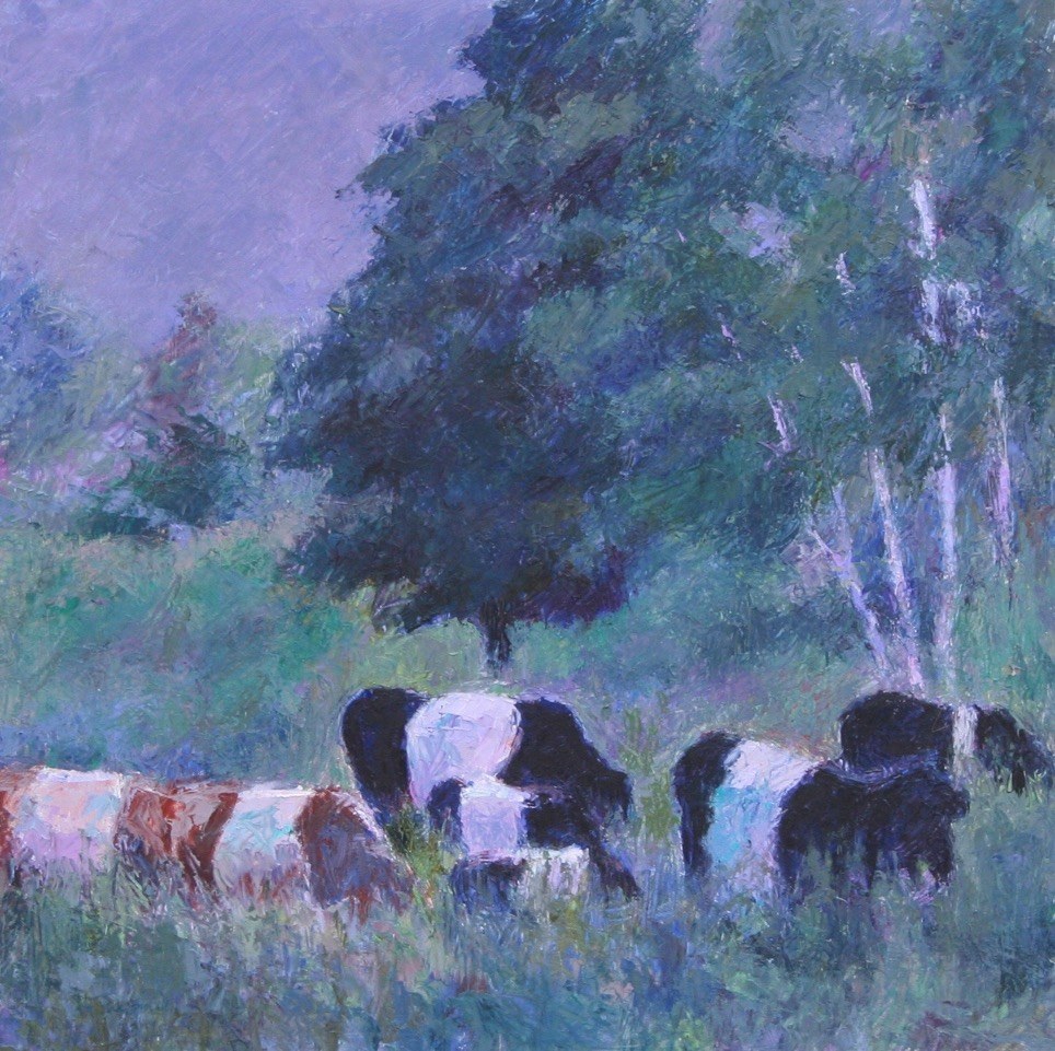 Alt text long description: The painting depicts a serene pastoral scene featuring several cows grazing in a lush, green meadow. The cows, predominantly black and white, are depicted on the right side of the image. In the background, a cluster of tall trees with dense foliage dominates the scene, their leaves rendered in deep green and blue hues. The sky above has a soft palette of purples and blues, giving the painting a tranquil, almost dreamlike quality. The textured brushwork lends the scene a fluid and impressionistic feel, blending colors and forms harmoniously. Note: the alt text was written with support from the ASU Image Accessibility Creator AI tool.