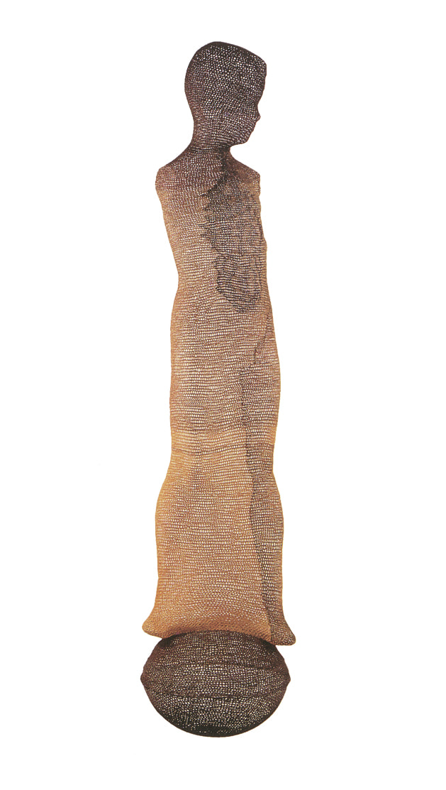 1990 was a period when Norma Minkowitz began to create large figurative works that were challenging in their stories and concepts. Boy was created in response to the Gulf War, also called Desert Storm, and addressed the vulnerability of our young soldiers. Minkowitz created an armless figure balancing on a ball, suggesting uncertainty and lack of control in a war situation.