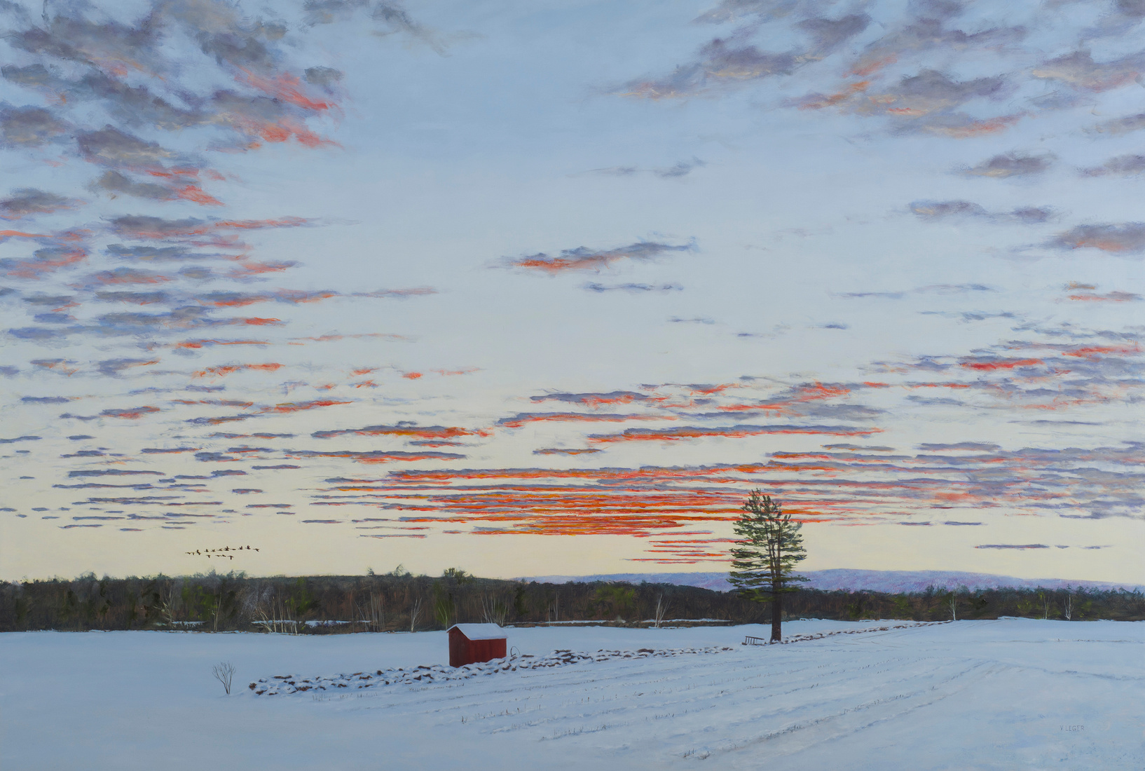 Alt text long description: A painting of a serene winter landscape at dawn or dusk, with a predominantly white snow-covered field in the foreground. A small, red-roofed structure is situated towards the lower right, accompanied by a lone tree with sparse branches. The sky dominates the upper half, filled with streaks of clouds colored in varying shades of blue, gray, and orange, suggesting the light from a rising or setting sun. A line of distant trees spans the horizon in dark silhouette. In the center left, a formation of birds flies across the sky. Note: the alt text was written with support from the ASU Image Accessibility Creator AI tool.