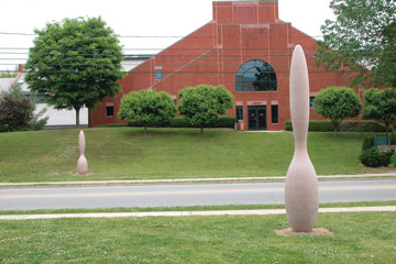 The artwork consists of two vertical granite forms that are placed on either side of Richards Avenue. The two vertical pieces are similar but different heights and proportions. The taller piece is places on the lawn in front of the new Center for Information Technology Building, to the right of the entrances and crosswalk as on faces the new building. The short piece is across Richards Avenue on the lawn in front of the East Campus Building just to the left of the crosswalk. The concept is to have these two vertical figures in conversation with each other. They visually connect the East and West Campuses. Because of their verticality and because they are round in cross section, they can be seen equally clearly from the buildings and lawns on both campuses as well as along Richards Avenue.