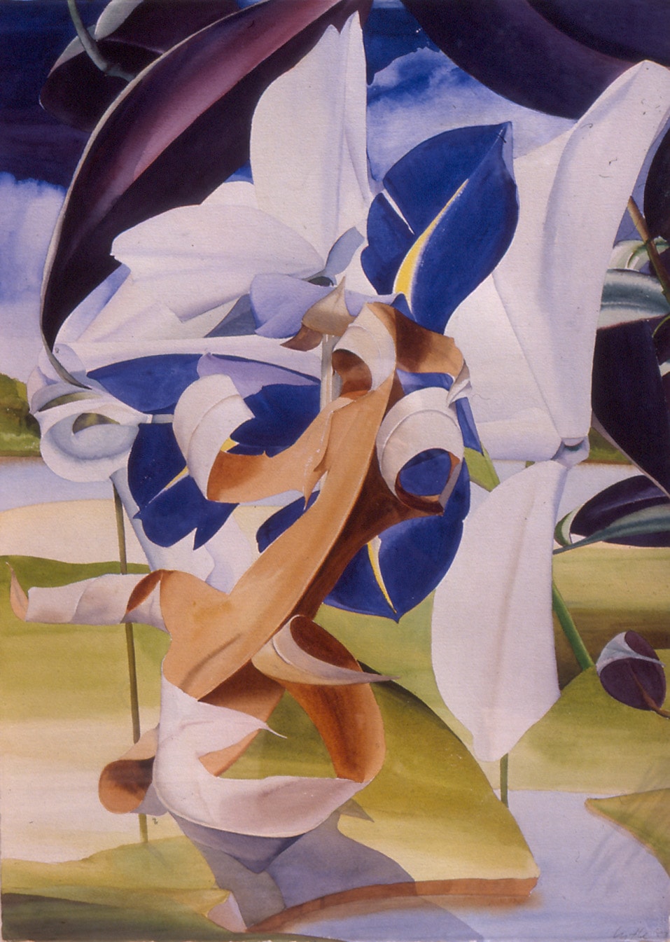 Alt Text Long Description: An abstract painting featuring intertwined shapes and vibrant colors. Central to the composition is a swirling arrangement of forms in blue, white, and brown, resembling stylized flowers or leaves. The blue and white elements suggest petals, with the blue being vivid and deep, while the white is soft and creamy. Brown, twisting shapes weave through the scene, providing a contrasting earthy tone. In the background, a gradient of green suggests a landscape or grassy area, adding depth to the image. The upper portion is dominated by dark and dramatic purple and deep blue hues, possibly indicating a sky or shadows. Note: the alt text was written with support from the ASU Image Accessibility Creator AI tool.