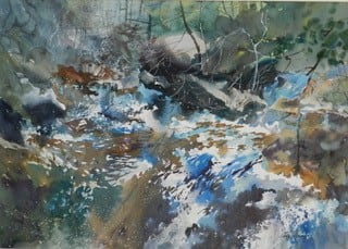 Alt text long description: A watercolor painting depicting a vibrant natural scene of a flowing river in a forest setting. The composition features a range of colors including blues, browns, greens, and whites, capturing the dynamic movement of water cascading over rocks. The river occupies the center of the painting, with swirls of blue and white suggesting the rush and foam of the water. Darker tones suggest the presence of rocks and shadowed areas, while greens and browns depict the surrounding forest and trees. The upper part of the painting shows the forest canopy with hints of branches and leaves, adding a sense of depth and enclosure to the scene. Note: the alt text was written with support from the ASU Image Accessibility Creator AI tool.
