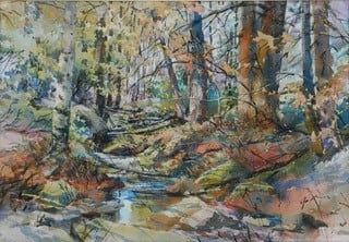 Alt text long description: A watercolor painting depicting a serene forest scene. A small stream meanders through the center, reflecting the surrounding environment. On either side of the stream, varied shades of green, brown, and yellow illustrate dense foliage and trees, capturing an autumnal atmosphere. Tall trees with slender trunks stand upright, their branches extending gracefully. The forest floor is covered with fallen leaves and patches of moss. The sunlight filters through the trees, casting gentle shadows and creating a dappled light effect on the stream and forest floor. Note: the alt text was written with support from the ASU Image Accessibility Creator AI tool.