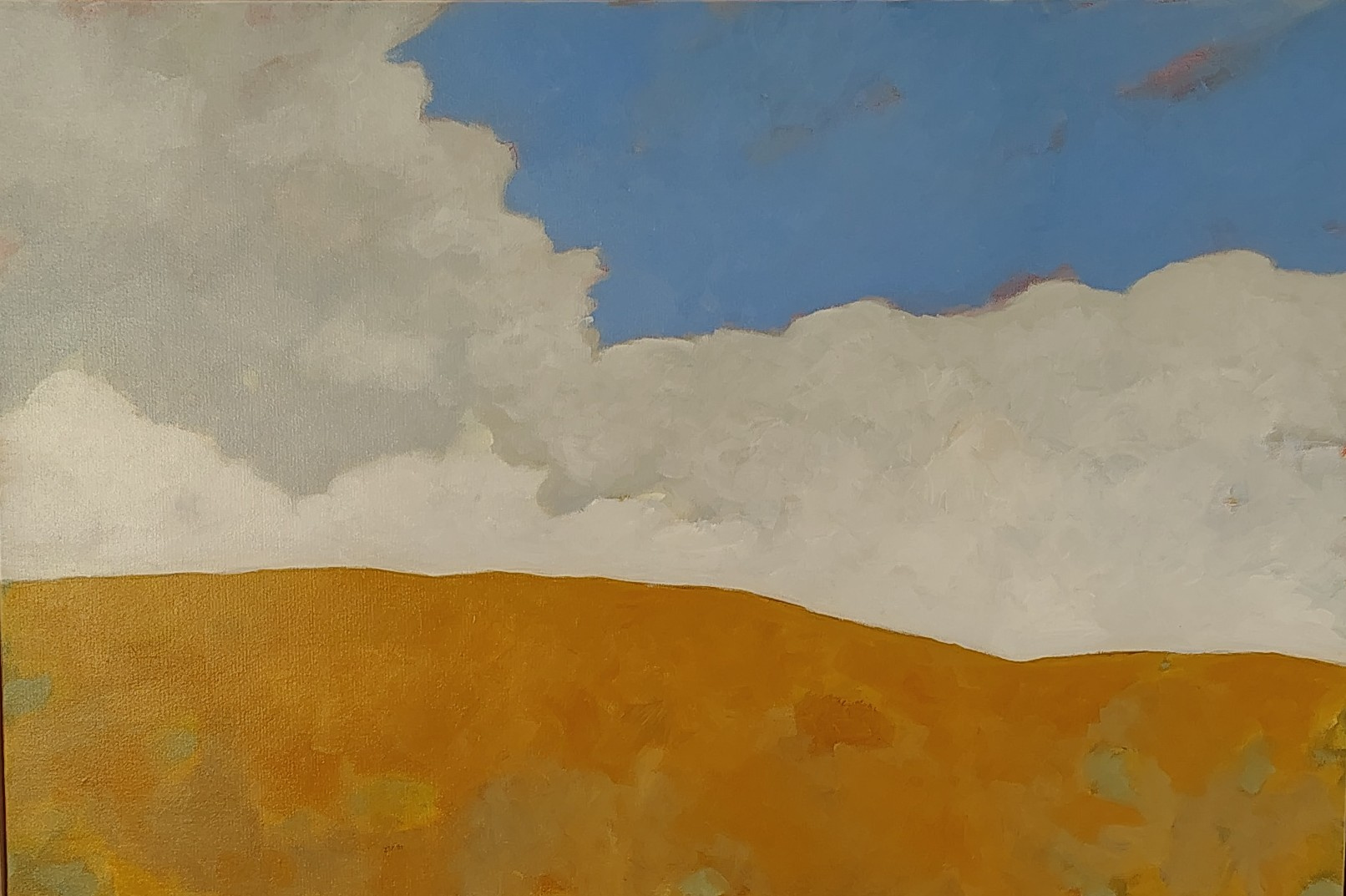 Alt text long description: The painting depicts a serene landscape composed primarily of a blue sky and large, fluffy cumulus clouds occupying most of the upper section. Below the clouds, a rolling hill stretches across the image. The hill is depicted in soft, earthy tones of brown and ochre, with subtle variations suggesting texture and gentle slopes. The bright blue of the sky contrasts with the warm tones of the hill. The painting uses broad, soft brushstrokes to convey a sense of tranquility and open space. Note: the alt text was written with support from the ASU Image Accessibility Creator AI tool.